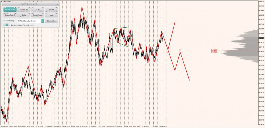 Среднесрочная тенденция: в лонг. Максимальное скопление объемов среднесрочной тенденции расположено в диапазоне по котировкам 1.35300-1.35400. В настоящий момент по паре совершаются инвестиционные операции выше, указывая на силу покупателей.