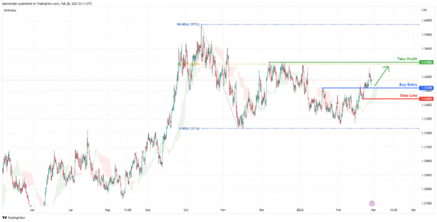 USD/CAD: ожидается рост до уровня сопротивления. Прогноз на 28 февраля 2023ИнстаФорекс - Instaforex, 2 года назад На 4-часовом графике пара USD/CAD торгуется с бычьим уклоном. В настоящее время цена находится ниже Облака Ишимоку. Рекомендуется покупать на откате на уровне 1.35208, где расположен недавний уровень поддержки. Прибыль может быть зафиксирована на уровне 1.37035, соответствующем уровню сопротивления и уровню коррекции Фибоначчи 61.8%. Стоп-лосс ордер может быть установлен на уровне 1.34446, где находится недавний уровень свинг-лоу. Торговая рекомендация Вход: 1.35208 Условия для входа: недавний уровень поддержки Тейк-профит: 1.37035 Условия для фиксации прибыли: уровень сопротивления и уровень коррекции Фибоначчи 61.8% Стоп-лосс: 1.34446 Условия для активации ордера стоп-лосс: недавний уровень свинг-лоу Материал предоставлен компанией InstaForex - www.instaforex.com |