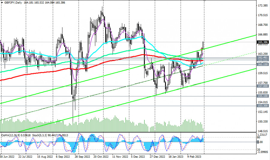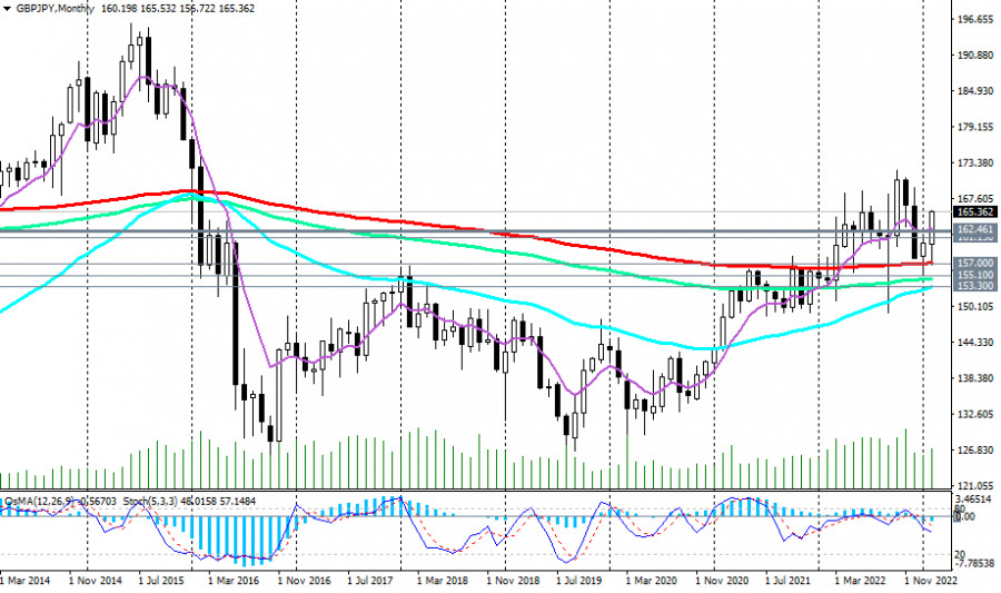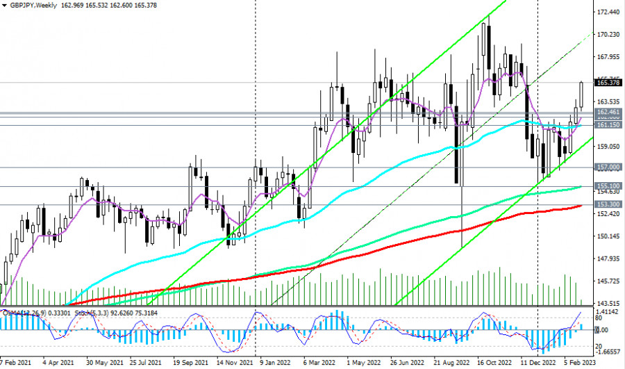 GBP/JPY: сценарии динамики на 28.02.2023ИнстаФорекс - Instaforex, 2 года назад Как мы отметили в нашем сегодняшнем «Фундаментальном анализе», иена слабеет на фоне комментариев кандидата на пост нового главы центрального банка Казуо Уэды, в то время как фунт укрепляется в основных кросс-парах. Это, соответственно, касается и пары GBP/JPY, которая «на момент публикации данной статьи торговалась выше отметки 165.30, укрепившись только за последние 2 неполных торговых дня на 1,5%, и уже 2 года оставаясь в зоне бычьего рынка, с момента пробоя отметки 142.00».Сегодня GBP/JPY продолжила рост, торгуясь выше ключевых уровней поддержки 162.00 (ЕМА200 на дневном графике), 157.00 (ЕМА200 на месячном графике), 153.30 (ЕМА200 на недельном графике). Технические индикаторы OsMA и Стохастик на дневном и недельном графиках также находятся на стороне покупателей, в то время как сильный бычий импульс толкает пару в сторону максимумов прошлого года выше отметки 172.00. В альтернативном сценарии первым сигналом на продажу может стать пробой локального минимума 165.05, а затем - сегодняшнего локального минимума 164.08. А пока что предпочтительными остаются длинные позиции, короткие рассматриваются лишь как краткосрочная альтернатива. *) подробнее о событиях недели см. в Важнейшие экономические события недели 27.02.2023 – 05.03.2023 Уровни поддержки: 164.00, 163.00, 162.46, 162.30, 162.00, 161.15, 157.00 Уровни сопротивления: 166.00, 167.00, 168.00, 169.00, 170.00, 171.00