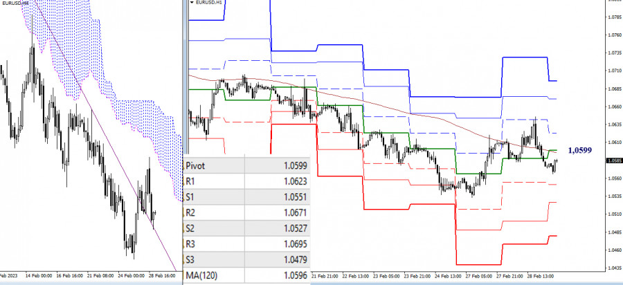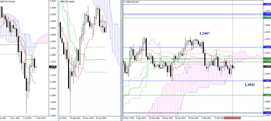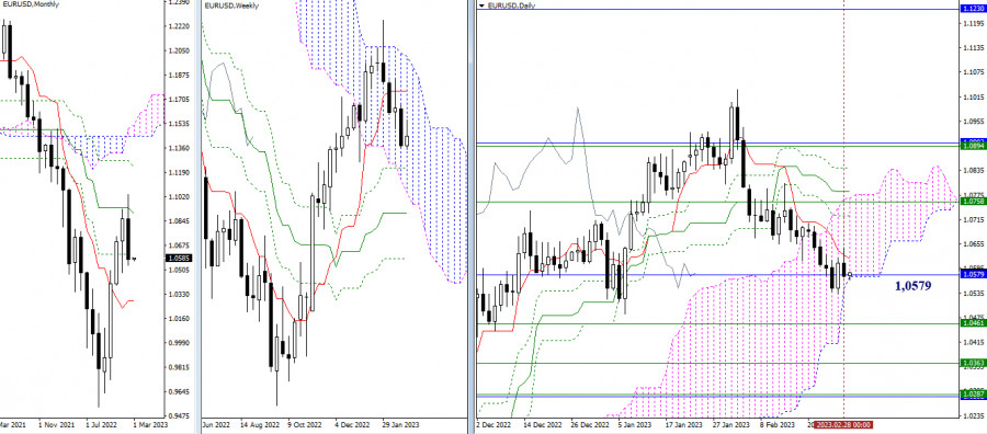 EUR/USD и GBP/USD 1 марта – технический анализ ситуацииИнстаФорекс - Instaforex, 2 года назад EUR/USD Старшие таймфреймы Февраль остался на месячном графике, как свеча с достаточно сильным медвежьим потенциалом. В феврале игроки на понижение реализовали отбой от протестированных сопротивлений, объединявших месячный среднесрочный тренд и верхнюю границу недельного облака Ишимоку. В итоге на март основной задачей для игроков на понижение является подтверждение и развитие сформированного февральского отбоя. В настоящий момент центром притяжения служит район 1,0579 – 1,0576 (месячный Фибо Киджун + нижняя граница дневного облака). Выход в медвежью зону относительно дневного облака и надёжное закрепление там помогут обозначить новую понижательную цель на пробой дневного облака. Кроме этого следующими понижательными ориентирами будут служить недельные поддержки (1,0461 – 1,0363 – 1,0284), усиленные месячным краткосрочным трендом (1,0284). Если же сейчас игроки на повышение проявят активность и вновь завладеют ситуацией, то в их задачи войдут такие этапы, как ликвидация дневного мёртвого креста Ишимоку (его уровни сегодня можно отметить на 1,0619 – 1,0724 – 1,0783 – 1,0842), выход в бычью зону относительно дневного облака (1,0777) и обретение поддержки недельного краткосрочного тренда (1,0758). Кроме этого особое значение будет иметь преодоление рубежа 1,0894 – 1,0901, там сейчас объединились два важных сопротивления – месячный среднесрочный тренд и верхняя граница недельного облака. Н4 – Н1 На младших таймах рынок не может пока определиться на более длительную перспективу, поэтому ключевые уровни так часто меняют свою принадлежность. Закрепление и работа выше ключевых уровней 1,0596-99 (центральный Пивот уровень дня + недельная долгосрочная тенденция) отдаёт преимущество игрокам на повышение. Дальнейшие повышательные ориентиры сегодня можно отметить на 1,0623 – 1,0671 – 1,0695 (сопротивления классических Пивот уровней). Закрепление и работа ниже ключевых уровней (1,0596-99) будет способствовать усилению медвежьих настроений. Ориентирами для развития снижения внутри дня являются поддержки ключевых уровней (1,0551 – 1,0527 – 1,0479). *** GBP/USD Старшие таймфреймы Февраль не смог покинуть диапазон январской свечи. В результате на месячном таймфрейме было сохранено преобладание неопределённости, которая способствует развитию консолидации. Для игроков на понижение в сложившихся условиях важно уйти за пределы месячного Фибо Киджуна (1,1842) и протестировать последующие поддержки, например, поддержки недельного креста Ишимоку (1,1648 – 1,1401) и месячный краткосрочный тренд (1,1401). Для игроков на повышение в первую очередь нужно преодолеть скопление сопротивлений в зоне 1,2100 – 1,2144 – 1,2232 – 1,2302 (уровни различных временных интервалов) и уйти за пределы январской месячной свечи (1,2447). Н4 – Н1 В настоящий момент на младших временных интервалах пара находится в зоне притяжения ключевых уровней 1,2030 – 1,2058 (центральный Пивот уровень дня + недельная долгосрочная тенденция). Расположение в зоне притяжения и влияния ключевых уровней лишает рынок явного преимущества. Обладание ключевыми уровнями и работа под ними будет способствовать развитию медвежьих настроений. Ориентирами для развития снижения внутри дня являются поддержки классических Пивот уровней. Сегодня они расположены на 1,1973 – 1,1930 -1,1845. Закрепление и работа 