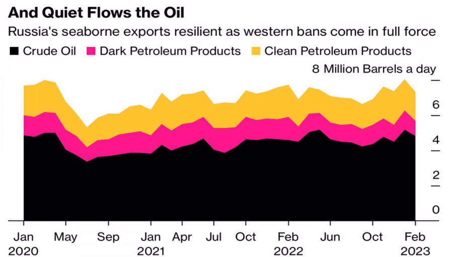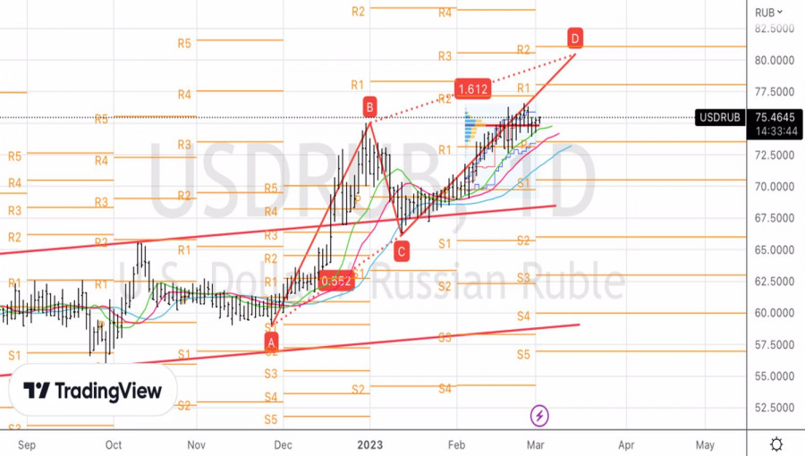 Рублю сделали больноИнстаФорекс - Instaforex, 2 года назад Сколько веревочке ни виться, а конец всегда один. Рубль обречен на слабость и продолжает катиться по наклонной на фоне расширения спреда Brent и Urals с $18,55 в ноябре до $29,24 за баррель, сокращения доходов от продажи нефти на 46% в годовом исчислении в январе и ухудшения состояния торгового баланса. Пара USDRUB достигла 10-летнего максимума, поднявшись на 20% с начала декабря, и это, похоже, далеко не предел. Вряд ли кого-то могут ввести в заблуждение оптимистичные прогнозы экспертов Reuters, видящих доллар на уровне 75 руб. к концу 2023, или российских аналитиков, предполагающих, что USDRUB будет торговаться в диапазоне 67-77 в текущем году. В их основе лежит фактор устойчивости экономики РФ к внешним потрясениям, который вторичен к потокам торгового характера в деле курсообразования рубля. Действительно, опрошенные Reuters специалисты ожидают, что российский ВВП в 2023 сократится на 1,9% после спада на 2,1% в 2022. При этом прогнозы разнятся: МВФ видит рост показателя на 0,3%, Moody's Investors Service – его падение на 3%. В основе устойчивости экономики РФ лежит ее переход на военные рельсы. В то время как в январе-феврале страна потратила 17% годового бюджета, а получила лишь 5,3% дохода, потребительский сектор испытывает серьезные проблемы. На его долю ранее приходилось более 50% от ВВП, и те факты, что розничные продажи падают 10-й месяц подряд, а доля сбережений растет, не сулят ничего хорошего для экономики. Динамика розничных продаж в России Успехи USDRUB в феврале могли бы быть куда более значимыми, если бы не поддержка продавцов со стороны правительства. Если в январе Россия продала юаней из Фонда национального благосостояния на 54,6 млрд руб., то в последний месяц зимы планировала удвоить эту сумму. Эта цифра составляет лишь 6% от общей величины резервов, так что запас прочности у рубля все-таки имеется. Но время неумолимо. Поддержку «медведям» по USDRUB оказывает информация о 7,32 млн б/с экспорте нефти и нефтепродуктов РФ в феврале, что сопоставимо с декабрьскими цифрами и лишь на 9% ниже исторического пика, имевшего место в январе. Кроме того, ученые из Института международных финансов, Колумбийского и Калифорнийского университетов бьют тревогу, утверждая, что средняя цена поставок российской нефти составляет $74 за баррель, что существенно выше ценового потолка G7 в $60. Динамика экспорта нефти и нефтепродуктов Россией Следует также отметить, что в феврале доллар США выглядел очень сильно из-за опасений по поводу роста ставки по федеральным фондам к 5,5%. Тем не менее если статистика по американской занятости за февраль разочарует, давление на «медведей» по USDRUB снизится. Технически пара обновление локального пика на 76,6 усилит риски продолжения ралли в направлении обозначенного ранее таргета на 161,8% по паттерну AB=CD и позволит нарастить сформированные от 66,45 лонги. Вместе с тем не исключен сценарий краткосрочных продаж USDRUB в случае падения ниже 73,5. Материал предоставлен компанией InstaForex - www.instaforex.com |