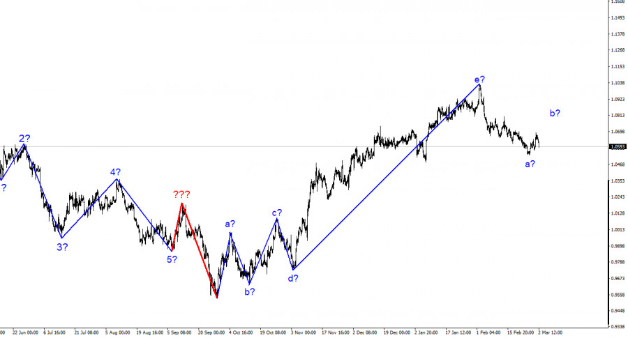 Анализ EUR/USD. 2 марта. Странная реакция рынка на отчет по инфляции в ЕСИнстаФорекс - Instaforex, 2 года назад Волновая разметка 4-часового графика для инструмента Евро/Доллар абсолютно не меняется в последнее время, что очень хорошо, так как мы понимаем, как может развиваться ситуация. Повышательный участок тренда принял ярко выраженный коррекционный (хотя его размер больше подходит для импульсного участка) вид. Мы получили структуру волн a-b-c-d-e, в которой волна e имеет гораздо более сложный вид, чем первые четыре волны. Если текущая волновая разметка верна, то построение этой структуры завершено, а волна e получилась гораздо протяженнее всех предыдущих волн. Нас ожидает построение минимум трех волн вниз, поэтому я по-прежнему ожидаю сильного снижения инструмента. Однако на несколько дней или недель инструмент может взять паузу. Отход котировок от достигнутых лоу в понедельник указывает на возможное начало волны 2 или b. Если это действительно так, то повышение котировок будет продолжаться некоторое время при любом новостном фоне. После завершения построения этой волны я в любом случае ожидаю нового достаточно сильного снижения, так как инструмент должен построить хотя бы три волны вниз и лишь потом можно будет размышлять о возможном новом повышательном участке. Европейская инфляция разочаровала, но не слишком сильноИнструмент Евро/Доллар в четверг снизился на 90 базовых пунктов. Падение инструмента началось практически в полночь. Далее спрос на евро падал без остановок на азиатской, европейской и американской сессиях. Исходя из такого движения, я могу сразу же сделать вывод: инструмент отстроил коррекционную волну b и теперь готов к построению нисходящей с. Предполагаемая волна b получилась достаточно короткой и откровенно неубедительной. Но внутри нее четко просматриваются три волны, поэтому она может считаться завершенной. Отмечу, что она может принять пяти волновой вид, но сегодняшнее движение показывает, что рынок больше настроен на продажи валюты ЕС, что является отличной новостью в разрезе текущей волновой разметке, предполагающей как раз дальнейшее понижение. Вернемся к отчету по инфляции. Основной показатель снизился в феврале с 8,6% до 8,5%, что, безусловно, очень мало. Вчера я предупреждал, что показатель может разочаровать, потому что в Германии инфляция в январе и феврале выросла. В некоторых других странах Евросоюза – тоже. Так или иначе, но замедление на 0,1% означает, что ЕЦБ нельзя отказываться от агрессивных шагов ужесточения денежно-кредитной политики. Базовый показатель инфляции вырос с 5,3% до 5,6%, а регулятор обращает больше внимания на базовое значение инфляции, которое еще ни одного раза не замедлилось с тех пор, как начало расти больше года назад. С уверенностью можно сказать, что оба значения инфляции разочаровали, но в таком случае спрос на евровалюту должен был вырасти, потому что подобные цифры означают, что ЕЦБ придется повышать ставку дольше и сильнее, чем он, возможно, рассчитывал. Однако, похоже, что рынок разочаровался в ЕЦБ, который начал ужесточение позже ФРС и Банка Англии, и делает это объективно медленнее. Общие выводыИсходя из проведенного анализа, я делаю вывод, что построение восходящего участка тренда завершено. Таким образом, сейчас можно рассматривать продажи с целями, расположенными около ра