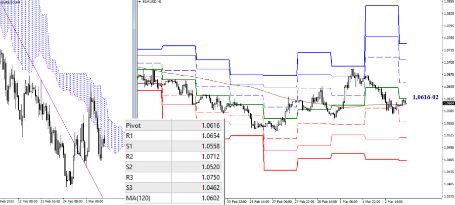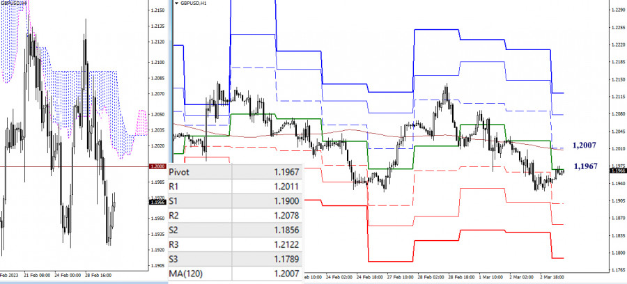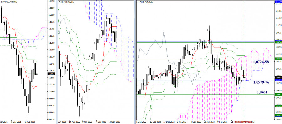 EUR/USD и GBP/USD 3 марта – технический анализ ситуацииИнстаФорекс - Instaforex, 2 года назад EUR/USD Старшие таймфреймы Вчера состоялась очередная дневная смена приоритетов, в результате чего рынок вернулся к рубежу 1,0579 – 1,0576, объединяющему усилия месячного уровня поддержки и нижней границы дневного облака. Возврат к данным уровням восстановил для игроков на понижение актуальность ранее обозначенных планов – выход в медвежью зону относительного дневного облака, формирование новой понижательной цели и реализация снижения до следующих поддержек старших временных интервалов, таких как недельные уровни (1,0461 – 1,0363 – 1,0284), усиленные месячным краткосрочным трендом (1,0284). Для игроков на повышение расположение и значение ориентиров тоже не изменилось, поэтому ближайшие сопротивления по-прежнему можно отметить на 1,0724-58 (дневной Фибо Киджун + недельный краткосрочный тренд). Н4 – Н1 На младших временных интервалах рынок вновь работает в зоне притяжения и влияния ключевых уровней, которые сейчас соединяются в районе 1,0616-02 (центральный Пивот-уровень дня + недельная долгосрочная тенденция). Длительное нахождение в данной зоне будет поддерживать неопределённость. Ориентирами для развития направленного движения на младших таймах служат уровни классических Пивот уровней – для игроков на повышение сопротивления 1,0654 – 1,0712 – 1,0750, для игроков на понижение поддержки 1,0558 – 1,0520 – 1,0462. *** GBP/USD Старшие таймфреймы Вчера инициатива принадлежала игрокам на понижение. Они подтвердили закрепление в медвежьей зоне относительно дневного облака. Ближайшая наиболее важная на данном участке задача для усиления медвежьих настроений заключается сейчас в обновлении минимальных экстремумов недельной (1,1914) и месячной (1,1840) консолидаций. Для игроков на повышение ближайшие сопротивления по-прежнему можно отметить на рубежах 1,2034 (дневной краткосрочный тренд) и 1,2100 – 1,2144 (дневные и недельные уровни). Н4 – Н1 Консолидация старших временных интервалов на младших таймах проявляется в виде бокового движения с частой сменой предпочтений. Так в настоящий момент основное преимущество на стороне игроков на понижение. Пара работает под ключевыми уровнями, расположенными сегодня на 1,1967 (центральный Пивот-уровень) и 1,2007 (недельная долгосрочная тенденция). При развитии движения внутри дня в качестве ориентиров пригодятся классические Пивот уровни – поддержки (1,1900 – 1,1856 – 1,1789) и сопротивления (1,2011 – 1,2078 – 1,2122). *** При техническом анализе ситуации использованы: старшие таймфреймы – Ichimoku Kinko Hyo (9.26.52) + уровни Фибо Киджун; младшие таймфреймы – Н1 – Pivot Points (классические) + Moving Avarage 120 (недельная долгосрочная тенденция). Материал предоставлен компанией InstaForex - www.instaforex.com |