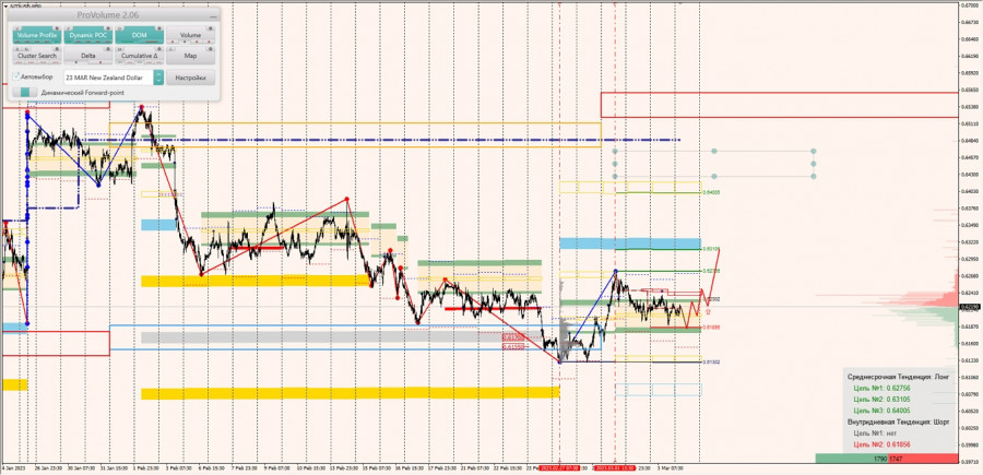 Среднесрочная тенденция: в лонг. Максимальное скопление объемов среднесрочной тенденции расположено в диапазоне по котировкам 0.61550-0.61700. В настоящий момент по паре совершаются инвестиционные операции выше, указывая на силу покупателей.