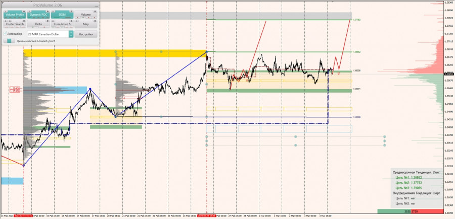 Среднесрочная тенденция: в лонг. Максимальное скопление объемов среднесрочной тенденции расположено в диапазоне по котировкам 1.35300-1.35400. В настоящий момент по паре совершаются инвестиционные операции выше, указывая на силу покупателей.