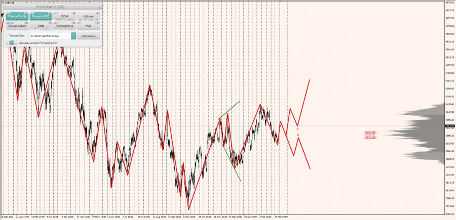 Альтернативный сценарий: при закреплении котировок индекса SNP500 ниже зоны 1/2 (3963.97) при откатах искать продажи по паттерну в новом диапазоне выгодных цен, с целями обновление минимумов и тестирование верхней границы НКЗ (3868.57).