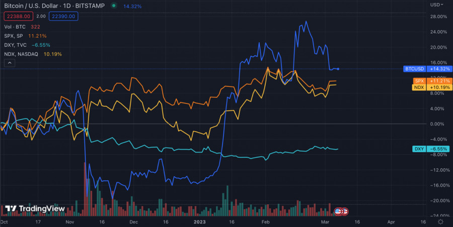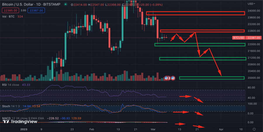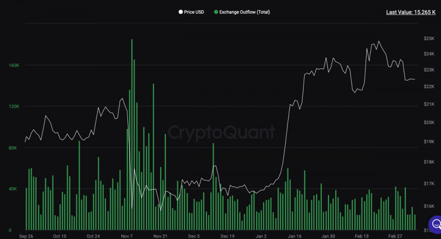 Bitcoin продолжает консолидироваться вблизи $22,5k: возможные варианты движения ценыИнстаФорекс - Instaforex, 2 года назад С наступлением новой торговой недели ситуация на криптовалютном рынке не изменилась. Цена продолжает консолидационное движение вблизи уровня $22,5k, а торговая активность остается на низком уровне. Рыночные настроения продолжают ухудшаться, что напрямую влияет на цену Биткоина. За последний месяц инвесторы перевели на криптобиржи более 22 000 BTC, что эквивалентно $505 миллионам. Дополнительные объемы криптовалюты на рынке усложняет сильное ценовое движение криптовалюты. При этом эксперты CryptoQuant отмечают, что, несмотря на сложный период, фундаментальная ценность криптовалюты не поддается сомнению. Более 60% предложения BTC контролируется долгосрочными инвесторами, что является бычьим фундаментальным сигналом. Однако в краткосрочной перспективе ситуация остается напряженной, так как Биткоин продолжает показывать зависимость от других высокорисковых активов. Это добавляет в прогнозы по движению цены криптовалюты неопределенность, и по состоянию на 12:00 BTC может пойти как на север, так и в нисходящем направлении. Фундаментальные факторыАналитики Bloomberg полагают, что медвежий рынок для криптовалют еще не закончился, а потому необходимо допускать вероятность повторного снижения за уровень $20k. Также стало известно, что большинство членов ФРС выступают за дальнейшее повышение ставки. Стоит напомнить, что, помимо повышения ставки, регулятор ежемесячно изымает более $80 миллиардов из экономики. Это эквивалентно повышению ставки на 0,5%-0,75%. Совокупность действий в рамках агрессивной монетарной политики ФРС приводит к общему снижению инвестиционной активности. Активизация процесса изъятия ликвидности привела к сохранению динамики по оттоку средств из криптофондов. Согласно данным CoinShares за прошлую неделю инвесторы вывели более $17 миллионов из крипто фондов. Анализ BTC/USDПо итогам 6 марта ценовое движение Биткоина оказалось минимальным. Актив продолжает консолидироваться вблизи уровня $24,4k, однако процесс протекает медленно из-за низкой торговой активности. Однако, как мы уже неоднократно убеждались, после консолидации следует мощное ценовое движение. По состоянию на 7 марта Биткоин имеет шансы отправиться к отметке $23k. Однако для этого криптовалюте необходимо совершить полноценный бычий пробой области $22,8k-$23k, которая является ключевой зоной сопротивления на текущем этапе движения цены. Также вблизи области $22,8k-$23k находится глобальный уровень Фибо 0,382, и сейчас этот рубеж служит зоной сопротивления. Следовательно, активу необходимы большие объемы, чтобы совершить пробой отметки и закрепиться выше $23k. В то же время Биткоин рискует продолжить нисходящее движение и достичь зоны поддержки $21,2k-$21,6k, где проходил массовый закуп лонгов. Предварительно медведям также необходимо будет совершить полноценный пробой $22k, где мы уже видели локальный откуп. ИтогиБиткоин продолжает консолидироваться вблизи уровня $22,4k. Актив может последовать в любом из направлений, однако при достижении минимума объемов торгов стоит ожидать импульсное движение цены. При этом актив продолжает движение в рамках области $22k-$24k, а следовательно, вероятность движения к верхней границе выше, чем повторный ретест нижней границы области колебаний. Матери