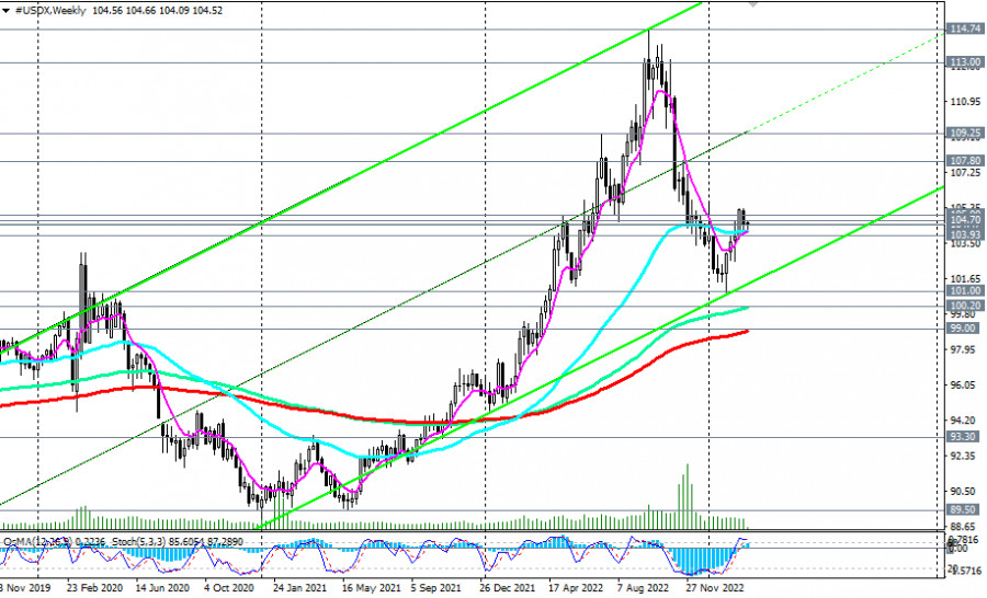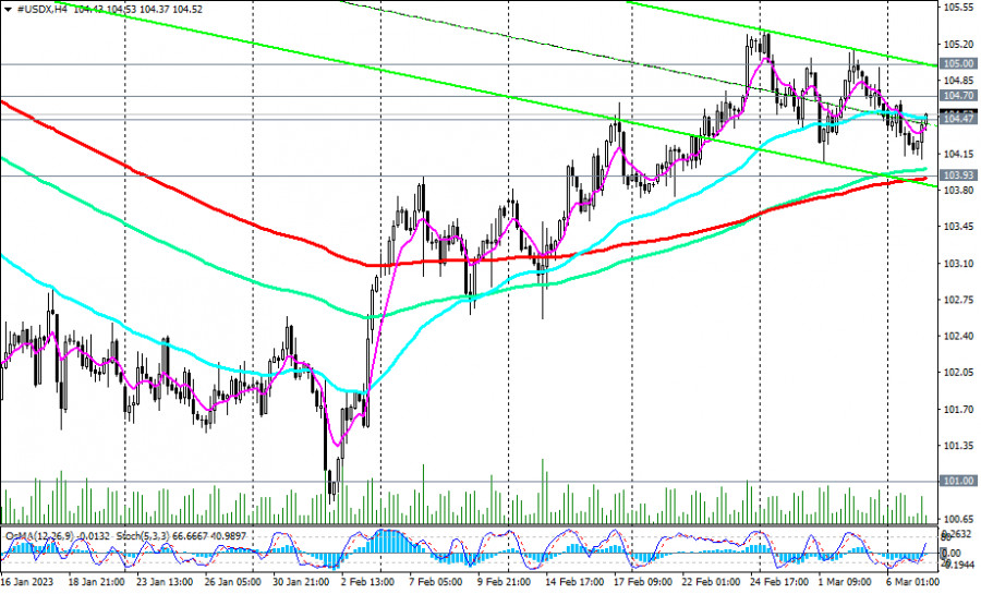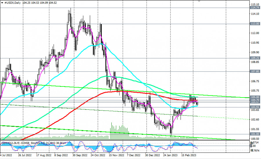 Индекс доллара #USDX: сценарии динамики на 07.03.2023ИнстаФорекс - Instaforex, 2 года назад Как мы отметили в нашем сегодняшнем Фундаментальном анализе, фьючерсы на индекс доллара DXY с середины прошлого месяца торгуются в достаточно узком диапазоне, между отметками 105.32 и 103.69. Начавшаяся в прошлом месяце восходящая коррекция индекса доллара застопорилась вблизи текущих отметок. Очевидно, что доллару нужны новые новостные или фундаментальные драйверы либо для роста, либо для возобновления снижения. Сигналом для возобновления длинных позиций может стать пробой уровней сопротивления 104.70 (ЕМА200 на дневном графике), 105.00 (ЕМА144 на дневном графике), 105.32 (локальный уровень сопротивления). Закрепившись в зоне выше этих отметок, цена может затем продолжить восходящую динамику в направлении максимумов прошлого года вблизи отметок 113.00, 114.00, 114.70. В альтернативном сценарии и после пробоя уровня поддержки 103.93 (ЕМА200 на 4-часовом графике) цена, вероятно, двинется в сторону ключевых уровней поддержки 100.20 (ЕМА144 на недельном графике), 99.00 (ЕМА200 на недельном графике). Самым первым сигналом для реализации данного сценария может стать пробой краткосрочного уровня поддержки 104.47 (ЕМА200 на 1-часовом графике). *) о важных событиях недели см. в Важнейшие экономические события недели 06.03.2023 – 12.03.2023 Уровни поддержки: 104.47, 104.00, 103.93, 103.69, 103.00, 102.00, 101.50, 101.00, 100.20, 99.00 Уровни сопротивления: 104.70, 105.00, 105.32, 106.00, 107.00, 107.80, 109.25