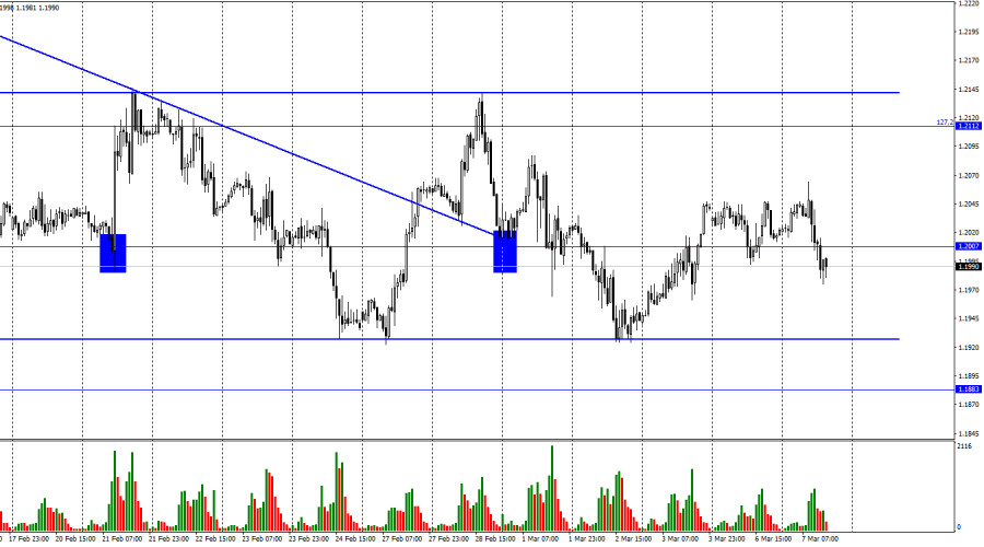 GBP/USD. 7 марта. Банк Англии обеспокоен ростом базовой инфляцииИнстаФорекс - Instaforex, 2 года назад Добрый день, уважаемые трейдеры! На часовом графике пара GBP/USD в понедельник простояла на одном месте весь день. В данное время остается горизонтальный коридор, а в понедельник еще и сама пара двигалась горизонтально. Просто комбо. Сегодня был выполнен разворот в пользу американской валюты и начат новый процесс падения в направлении нижней линии коридора. Закрепление курса пары под ним повысит вероятность дальнейшего падения в направлении следующего уровня 1,1883 и ниже. Отбой от линии сработает в пользу британца и некоторого роста в направлении коррекционного уровня 127,2% - 1,2112. Сегодня уже состоялось выступление одного из управляющих Банка Англии Кэтрин Манн. Как я уже говорил, мы потихоньку приближаемся к тому времени, когда центральные банки объявят результаты своих вторых заседаний в этом году, а в случае с британским регулятором сейчас непонятно даже, насколько будет повышена ставка в текущем месяце. Вероятнее всего, опять на 0,50%, потому что инфляция сохраняется на очень высоком значении. Возвращаясь к выступлению Кэтрин Манн, она сообщила, что «со ставками следует сделать больше». Очевидно, что имелось ввиду более сильное повышение процентной ставки, но сейчас все зависит не только от действий Банка Англии, но и от действий ФРС. Если сегодня Джером Пауэлл также даст понять, что ставка продолжит расти, а регулятор не беспокоится о возможной рецессии, то и доллар США получит новый козырь на свои руки. Кэтрин Манн также заявила, что она обеспокоена сохранением базовой инфляции, а центральные банки ЕС и США были достаточно «жестко» настроены по ДКП. Отсюда можно сделать вывод, что Банк Англии не будет сбавлять обороты в ближайшее время. Но для фунта все это будет иметь значение только в том случае, если он покинет горизонтальный коридор. Внутри коридора он может двигаться абсолютно любым образом. Сегодня мы увидели падение, которое не было вызвано информационным фоном (хоть, может быть, трейдеры покупали доллар из-за вечернего выступления Пауэлла). Завтра может быть такой же рост. На 4-часовом графике пара выполнила новый разворот в пользу американской валюты, но в последнее время развороты стали очень частым явлением на рынке. Уровень 1,2008 трейдеры практически не замечают. Новых назревающих дивергенций не наблюдается. Трендового коридора или линии нет. Ситуация достаточно запутанная, я советую большее внимание уделять анализу часового графика, но там тоже не все сейчас однозначно. Отчет Commitments of Traders (COT):