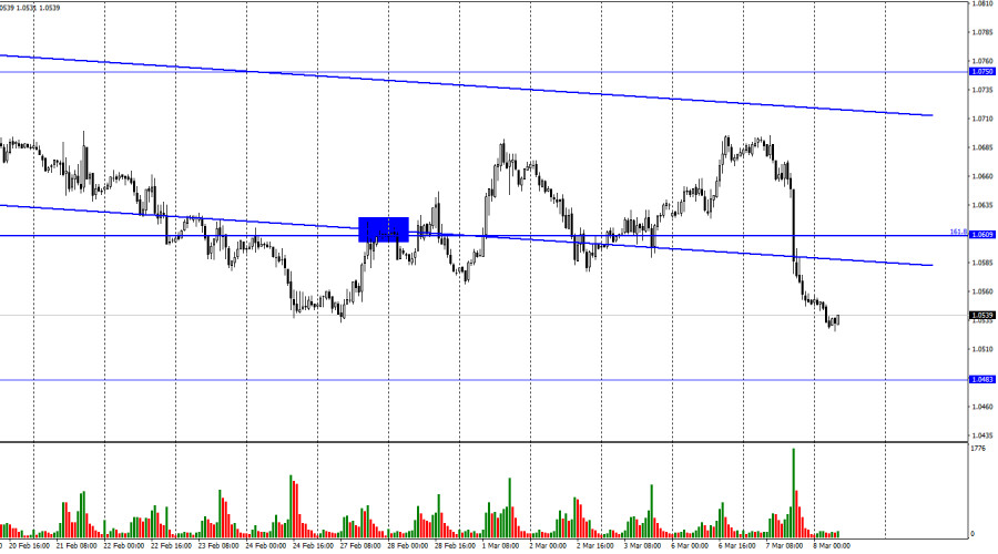 EUR/USD. 8 марта. Джером Пауэлл ошарашил рынкиИнстаФорекс - Instaforex, 2 года назад Добрый день, уважаемые трейдеры! Пара EUR/USD во вторник выполнила разворот в пользу американской валюты и обвалилась вниз, закрепившись под нисходящим трендовым коридором и уровнем коррекции 161,8% – 1,0609. Таким образом, процесс падения может быть продолжен в направлении уровня 1,0483. В то же время котировки пары достигли уровня прошлого локального лоу, от которого может последовать отбой и некоторый рост. Во вторник Джером Пауэлла, выступая в банковском комитете Сената США, заявил, что процентную ставку, вероятно, придется повысить сильнее, чем ожидалось. Он отметил, что ФРС сохраняет приверженность цели по возврату инфляции к 2%, но сроки достижения цели могут быть очень значительными. По крайней мере, о возврате к целевому уровню в 2023 году речи не идет. Он также допустил, что для взятия под контроль индекса потребительских цен могут потребоваться более серьезные меры со стороны ФРС и даже новое ускорение повышения ставки. «Если совокупность экономических отчетов будет показывать необходимость увеличения темпов повышения ставки до 0,50%, мы сделаем это», – заявил президент ФРС. После этого выступления доллар США резко вырос, а трейдеры перевели свое внимание на пятничный отчет по пэйроллам. Теперь общее мнение таково: если отчет опять получится сильным, в марте ставка ФРС поднимется на 0,50%. Для этого будут просто все необходимые основания, на которые и намекал Пауэлл. И, возможно, еще будет намекать сегодня, когда состоится его второе выступление в Сенате. Рынок труда показывает беспрецедентно высокие цифры, уровень безработицы – на минимуме, а инфляция начала снижаться слишком медленно, чтобы оставаться спокойным. Если Nonfarm Payrolls в пятницу не подведут, то ФРС может пойти на более жесткие меры 21-22 марта. А доллар может продолжать рост в этом случае. На 4-часовом графике пара выполнила закрепление под восходящим трендовым коридором, что позволяет по-прежнему ожидать дальнейшее падение, так как пара покинула коридор, в котором находилась с октября. Настроение трейдеров характеризуется, как «медвежье», что открывает отличные перспективы роста для американской валюты с целью 1,0201. Новых назревающих дивергенция пока не наблюдается ни у одного индикатора. Отчет Commitments of Traders (COT):