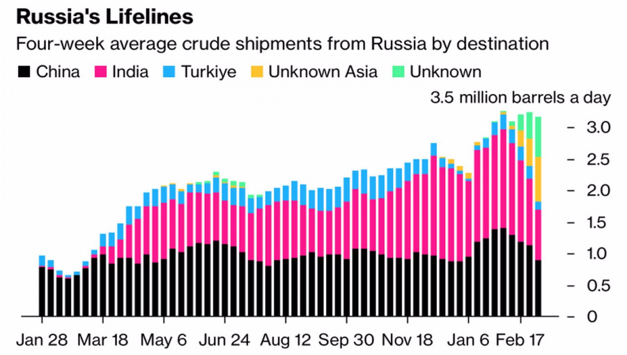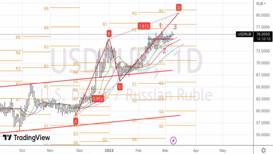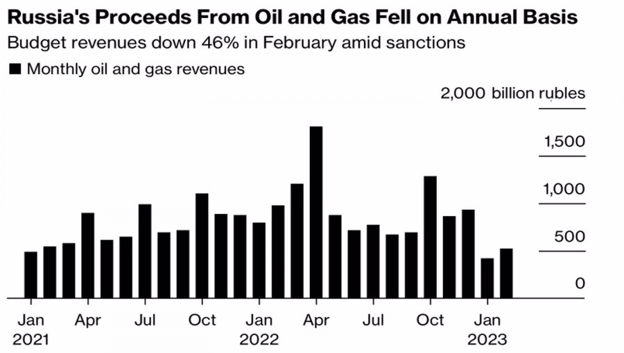 Рубль расширяет пул покупателейИнстаФорекс - Instaforex, 2 года назад Самое страшное позади? Или не было бы хуже? Стабилизация котировок USDRUB говорит о том, что рынок взвешивает между улучшением ситуации после катастрофы в январе-феврале и ее дальнейшим ухудшением. Поступающий инсайд Bloomberg о расширении пула азиатских покупателей российской нефти воспринимается поклонниками рубля как луч света в царстве туч. Но не выдают ли они желаемое за действительное? Начало года действительно стало катастрофой для «медведей» по USDRUB. Доходы РФ от продажи нефти и газа в январе-феврале сократились на 42% г/г, а дефицит бюджета подскочил до $34 млрд на фоне снижения валютной выручки и увеличения военных расходов. Речь идет о цифре, близкой к запланированным правительством $39 млрд, или 2% от ВВП в 2023. И она была почти достигнута всего лишь за два месяца! Динамика доходов бюджета России от продажи нефти и газа Встречный ветер для рубля, курс которого определяется исключительно потоками торгового характера, и попутный для доллара США в виде сильной статистики по Штатам и ожиданий роста ставки по федеральным фондам до 5,5% привел к ралли USDRUB на 8,6% с начала года. Рубль затесался в аутсайдеры среди основных мировых валют, опережая разве что норвежскую крону и южноафриканский ранд. В марте ситуация рискует измениться. S&P Global считает, что Россия в состоянии поддерживать добычу на высоком уровне дольше, чем ожидают финансовые рынки. О падении производства черного золота со скалы, как об этом говорили все кому не лень год назад, сейчас речи не идет. Были бы покупатели! И они, согласно инсайду Bloomberg, находятся в Азии. Китайские и индийские компании перекладывают поставку нефти на плечи продавцов, что позволяет им не заботиться о страховании грузов и западных санкциях. Цены на Urals с доставкой в Китай были ниже Brent на $10, российский сорт BCTO продавался с дисконтом в $6-7 за баррель, что на $2 выше, чем в феврале. При этом США утверждают, что Индия не нарушает ценовой потолок G7 в $60 за баррель. Не стоит скептически относиться и к сокращению морского экспорта российской нефти. Данные постоянно скачут, от пика к впадине и наоборот. Динамика и структура поставок российской нефти О том, что ситуация не так критична, как в начале года, говорит и намерение Минфина сократить объем продаж иностранной валюты для поддержания курса рубля до 119,8 млр руб., или $1,6 млрд в марте. Это на 40% меньше, чем в феврале. Если в таких условиях еще и доллар США начнет терять позиции из-за слабой занятости и замедления инфляции, USDRUB рискует пойти на коррекцию. Технически неспособность пары переписать февральский пик усиливает риски активации паттерна 1-2-3 с последующим откатом. Падение котировок ниже пивот-уровня 75,58 и справедливой стоимости на 75,05 позволит нам зафиксировать прибыль по ранее сформированным лонгам и перевернуться. Вместе с тем таргет на 161,8% по AB=CD никто не отменял, поэтому от краткосрочных продаж через некоторое время будем переходить к среднесрочным покупкам USDRUB. Материал предоставлен компанией InstaForex - www.instaforex.com |