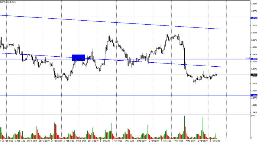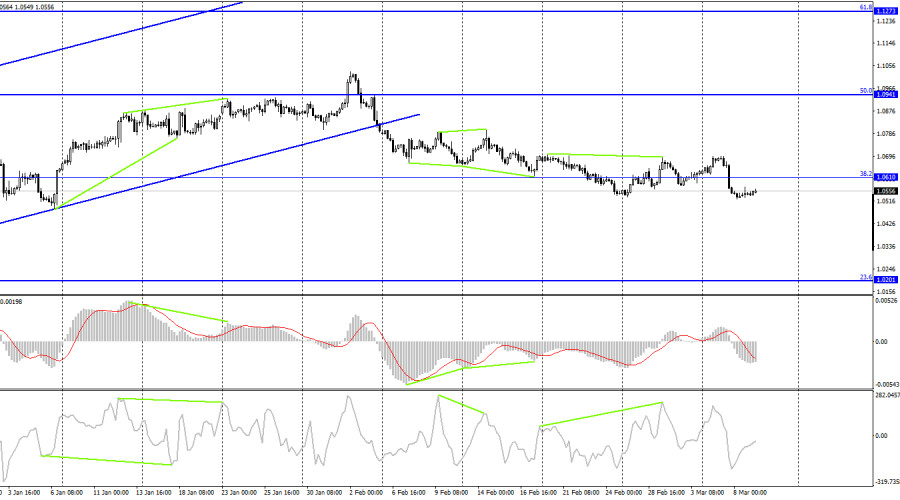 EUR/USD. 9 марта. Джером Пауэлл сдал назад, но уже поздноИнстаФорекс - Instaforex, 2 года назад Добрый день, уважаемые трейдеры! Пара EUR/USD в среду выполнила разворот в пользу валюты ЕС и начала медленный и слабый рост в направлении коррекционного уровня 161,8% - 1,0609. Рост в течение вчерашнего дня был настолько слабым, что о нем даже говорить не стоит. Ни выступление Джерома Пауэлла, ни выступление Кристин Лагард, ни отчет ADP не повлияли на настроение трейдеров. Таким образом, сейчас мы имеем дело с техническим отходом котировок после сильного падения, но близится пятница и очень важная статистика в США, которая может вернуть на рынок медведей снова. Вчера в Конгрессе США состоялось второе выступление президента ФРС Джерома Пауэлла. Вполне ожидаемо, ничего нового в речи Пауэлла не прозвучало, однако некоторые эксперты заметили некоторое смягчение риторики главы FOMC. На этот раз Пауэлл заявил, что решение по ставке еще не принято, а ФРС хочет дождаться отчетов по инфляции и рынку труда прежде, чем его принимать. Сутками ранее Пауэлл был гораздо более категоричен и практически пообещал повысить ставку в марте на 0,50%. Однако трейдеры никак не восприняли выступление Пауэлла в среду. Его более мягкая риторика была похожа на попытку «дать заднюю». Трейдеры уже уверились в том, что ставка будет расти дольше и сильнее, в марте будет повышение на 0,50%, и эти факторы могут продолжать стимулировать доллар к росту. Заседание ФРС состоится 21-22 марта, поэтому времени на покупки американской валюты у трейдеров предостаточно. А в Великобритании как не было новостей, так и нет. В ту же пятницу выйдет 1-2 интересных отчета, которые сразу же могут попасть в тень, потому что через несколько часов после их выхода будут опубликованы гораздо более важные данные, которые имеют непосредственное влияние на решения, которые принимает FOMC. Безусловно, они имеют гораздо более высокий приоритет для трейдеров. На 4-часовом графике пара выполнила закрепление под восходящим трендовым коридором, что позволяет по-прежнему ожидать дальнейшее падение, так как пара покинула коридор, в котором находилась с октября. Настроение трейдеров характеризуется как «медвежье», что открывает отличные перспективы роста для американской валюты с целью 1,0201. Новых назревающих дивергенция пока не наблюдается ни у одного индикатора. Отчет Commitments of Traders (COT):