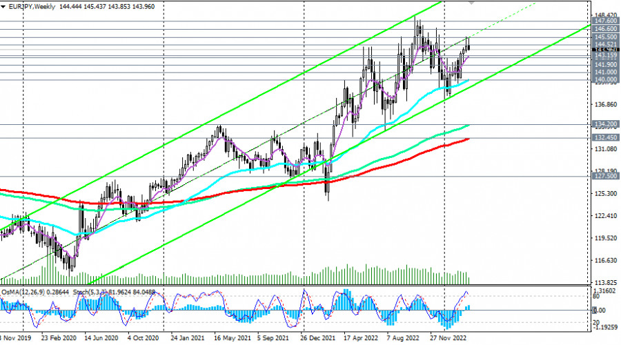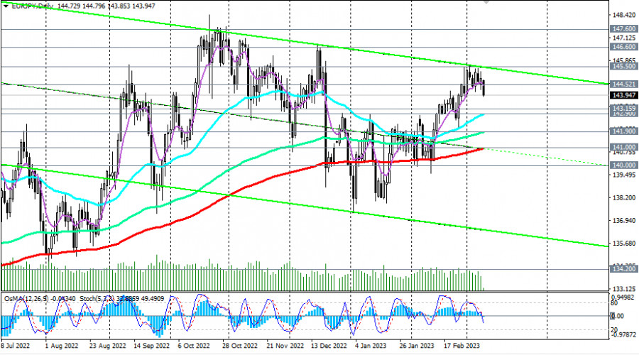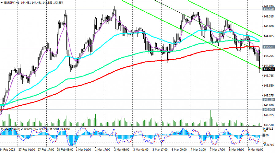 EUR/JPY: сценарии динамики на 09.03.2023ИнстаФорекс - Instaforex, 2 года назад Как мы отметили в нашем сегодняшнем «Фундаментальном анализе», евро сегодня растёт против доллара, но снижается против иены, несмотря на долгосрочный бычий тренд EUR/JPY. На момент публикации статьи пара EUR/JPY торговалась вблизи отметки 144.00, пробив в ходе азиатской торговой сессии важный краткосрочный уровень поддержки 144.52 (ЕМА200 на 1-часовом графике). В целом пара сохраняет бычий импульс, торгуясь в зоне также бычьего рынка, выше ключевых уровней поддержки 132.45 (ЕМА200 на недельном графике), 134.20 (ЕМА144 на недельном графике), 104.00 (ЕМА50 на недельном графике), 141.00 (ЕМА200 на дневном графике), 141.90 (ЕМА144 на дневном графике). Если снижение продолжится, то пробой очередных уровней поддержки 143.16 (ЕМА200 на 4-часовом графике), 142.90 (ЕМА50 на дневном графике) станет подтверждающим сигналом о зарождающемся среднесрочном медвежьем тренде с ближайшими целями на уровнях поддержки 141.90, 141.00. Пробой уровня поддержки 140.00 и локального уровня поддержки 138.00 спровоцирует более глубокое снижение к ключевым уровням поддержки 134.20, 132.45 и, возможно, к уровню ключевому поддержки 127.50 (ЕМА200 на месячном графике), отделяющему долгосрочный бычий тренд от медвежьего. Но пока что все говорит в пользу продолжения роста пары. В свою очередь, пробой уровня сопротивления 144.52 станет сигналом для возобновления длинных позиций. Хотя возможен вход по текущей цене или при превышении отметки 144.00 с ограничительными стопами ниже сегодняшнего локального минимума 143.74. *) о важных событиях недели см. в Важнейшие экономические события недели 06.03.2023 – 12.03.2023 **) об особенностях торговли парой EUR/JPY см. в статье EUR/JPY: валютная пара (характеристики, рекомендации) Уровни поддержки: 144.00, 143.16, 142.90, 141.90, 141.00, 140.00, 137.90, 134.20, 132.45 Уровни сопротивления: 144.52, 145.00, 145.50, 146.00, 146.60, 147.00, 147.60