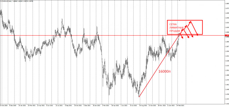 EURAUD – возможен старт сетки лимитных продажИнстаФорекс - Instaforex, 2 года назад Добрый день, уважаемые трейдеры! Представляю вашему вниманию торговую идею по EURAUD. Итак, начиная с лета 2022 инструмент с небольшими откатами прошёл 16000 пунктов и на сегодняшний день снова переписал вершину прошлого года, создавая новые условия для набора сетки лимитных продаж по следующей схеме: Начиная с текущих цен и выше возможна установка сетки лимитных покупок с шагом 1000 п. |