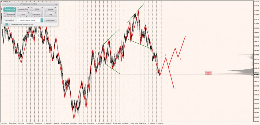 Долгосрочная тенденция: в шорт. Максимальное скопление объемов текущего контракта расположено в диапазоне по котировкам 0.65800-0.66000. В настоящий момент по паре совершаются инвестиционные операции внутри указанного диапазона, указывая на временную неопределенность.