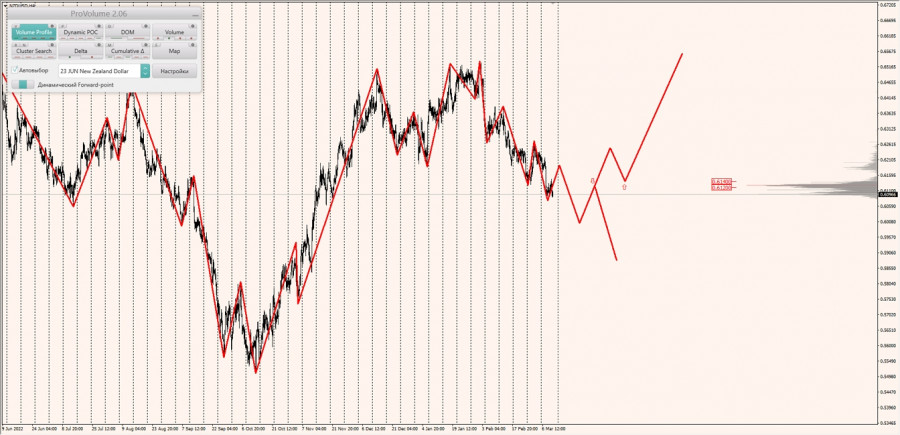 Долгосрочная тенденция: в шорт. Максимальное скопление объемов текущего контракта расположено в диапазоне по котировкам 0.61200-0.61400. В настоящий момент по паре совершаются инвестиционные операции ниже, указывая на силу продавцов.