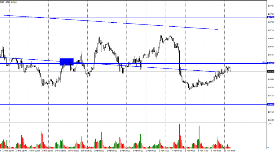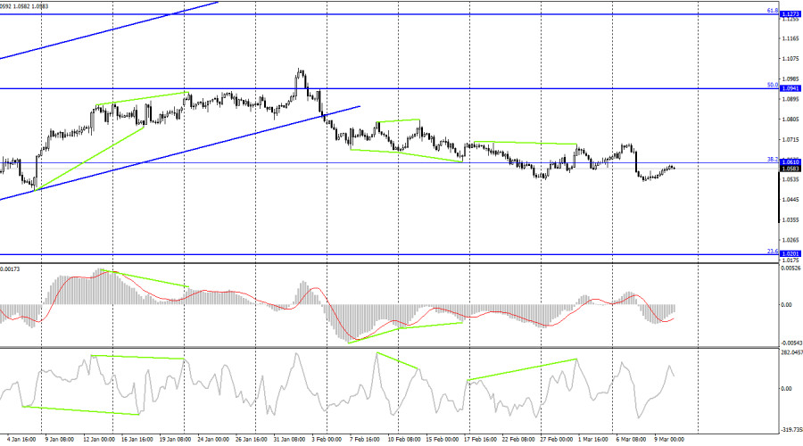 EUR/USD. 10 марта. Кристин Лагард оценила состояние экономики Евросоюза как положительноеИнстаФорекс - Instaforex, 2 года назад Добрый день, уважаемые трейдеры! Пара EUR/USD в четверг продолжала процесс роста в направлении коррекционного уровня 161,8% - 1,0609. Рост не имел под собой никаких информационных оснований, вчера в течение дня вышел лишь отчет по заявкам на пособия по безработице, который редко влияет на настроение трейдеров. Отбой котировок от уровня 1,0609 сработает в пользу американской валюты и возобновления падения в направлении уровня 1,0483(1,0532). Закрытие курса пары над 1,0609 повысит вероятность дальнейшего роста в направлении уровня 1,0700. На этой неделе состоялись выступления Кристин Лагард и Джерома Пауэлла. Трейдеры обратили пристальное внимание на выступление Пауэлла в Конгрессе и его слова о возможном более сильном ужесточении ДКП. А выступление Лагард осталось в тени этого события, хотя президент ЕЦБ также заявила, что ставка продолжит расти, а инфляция остается слишком высокой, чтобы отказываться от дальнейшего ужесточения. Помимо этого, Лагард оценила текущее состояние экономики, как удовлетворительное, отметила низкую безработицу(минимальный в истории уровень) и практически пообещала увеличение ставки на мартовском заседании на 0,50%. Также она сообщила, что ставка будет продолжать расти на следующих заседаниях, но темпы ее роста будут зависеть от поступающей экономической информации. Я оцениваю выступления Пауэлла и Лагард приблизительно одинаково. Разница лишь одна: ставка ФРС выше и будет оставаться таковой еще длительный период времени. Это различие и может поддерживать доллар США в следующие недели или месяцы. Но вряд ли слишком сильно. Ставка ФРС в любом случае приближается к своему пиковому значению, а инфляция снижается уже 7 месяцев подряд. ЕЦБ же имеет возможность повысить свою ставку сильнее в 2023 году, чем ФРС – свою. На 4-часовом графике пара выполнила закрепление под восходящим трендовым коридором, что позволяет по-прежнему ожидать дальнейшее падение, так как пара покинула коридор, в котором находилась с октября. Настроение трейдеров характеризуется, как «медвежье», что открывает отличные перспективы роста для американской валюты с целью 1,0201. Новых назревающих дивергенция пока не наблюдается ни у одного индикатора. Отчет Commitments of Traders (COT):
