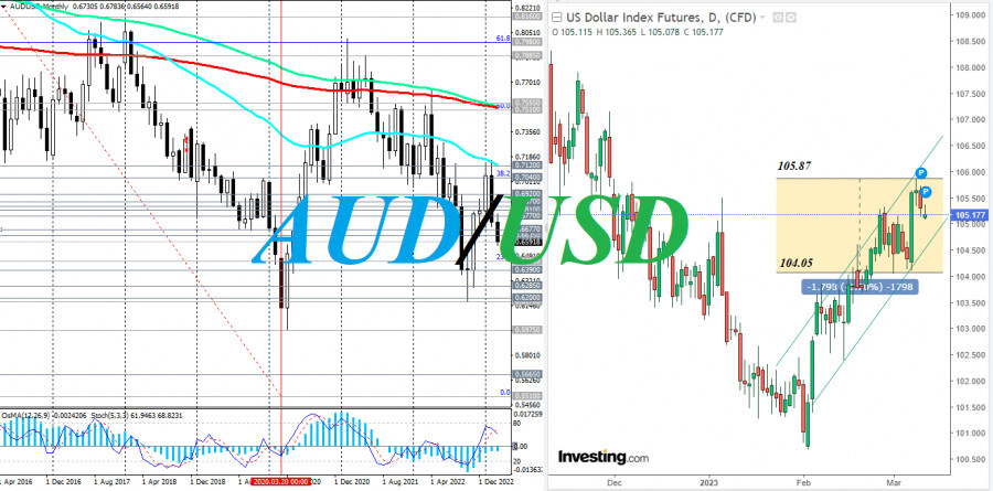 AUD, USD: краткие итоги и ближайшие перспективыИнстаФорекс - Instaforex, 2 года назад Завершается весьма насыщенная важными событиями экономического характера неделя, с почти экстремальной волатильностью. Основные события, можно сказать, начали развиваться во вторник, после того как РБ Австралии ожидаемо повысил процентную ставку на 0,25% и даже высказался в пользу дальнейшего ужесточения монетарной политики. Тем не менее, несмотря на это решение, австралийский доллар рухнул во вторник и, несмотря на попытки, остается на текущий момент вблизи минимумов, достигнутых в этот день. Вероятно, участники рынка сочли сопутствующее заявление банка недостаточно жёстким. Оно подтвердило, что РБА планирует повысить ставку в ближайшие месяцы. Руководители РБА "решительно настроены на возвращение инфляции к целевому уровню". Однако сроки и размеры этих повышений будут зависеть от поступающих данных, в то время как "рост австралийской экономики замедлился". В то же время экономисты ожидают повышение процентной ставки РБА еще как минимум на 25 б.п. в апреле и мае до пика на отметке 4,1%, исходя из текущей ситуации в стране, где общая инфляция снижается из-за падения цен на энергоносители, но повышательное давление на инфляцию все же сохраняется во многих других областях, особенно в сфере услуг и заработной платы. В РБА "решительно настроены на возвращение инфляции к целевому уровню (2%-3%)", и "совет ЦБ ожидает, что потребуется дальнейшее ужесточение денежно-кредитной политики", - заявил глава РБА Филипп Лоу по итогам мартовского заседания банка. В связи с этим, пожалуй, не стоит ожидать дальнейшего сильного снижения AUD. Вряд ли цикл повышения процентных ставок в Австралии закончится в ближайшее время, считают экономисты. Что касается пары AUD/USD, она на момент публикации статьи торгуется вблизи отметки 0.6590, в зоне устойчивого долгосрочного и среднесрочного медвежьих рынков, на уровне цены закрытия в такой неудачный для этой пары вторник, учитывая, также что в этот день в Конгрессе США выступал глава ФРС Джером Пауэлл. Он не подвел покупателей доллара, заявив, что, если совокупность поступающих данных укажет на необходимость более быстрого ужесточения, мы (в ФРС) готовы увеличить темпы повышения ставок, а конечная ставка будет выше, чем ожидалось ранее. Предстоит пройти долгий путь по снижению инфляции, дорога, вероятно, будет ухабистой, сказал Пауэлл. Заявления, сделанные Пауэллом, рынок счел как ястребиные, и сразу же после его выступления доллар США резко укрепился, десятилетняя доходность облигаций США выросла с 3,92% до уровня выше 4%, а двухлетняя достигла 4,97%, самого высокого уровня с 2007 года. В своем втором выступлении (в среду) Джером Пауэлл подтвердил, что руководители американского ЦБ привержены снижению цен. Инфляция снижается, но она очень высока, и конечный уровень ставок должен быть выше, сказал он. В то же время Пауэлл сделал некоторые оговорки, которые заставили чересчур оптимистичных покупателей доллара уменьшить свои агрессивные ожидания в отношении американской валюты. Пауэлл сказал, что в руководстве ФРС еще не приняли никакого решения относительно мартовского заседания, это зависит от поступающих данных. Замедление темпов повышения ставок в этом году - это способ лучше следить за такими (запаздывание эффектов денежно-кредитной политики) 