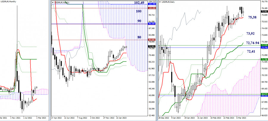 USD/RUR – итоги и перспективыИнстаФорекс - Instaforex, 2 года назад USD/RUR Пара последнее время испытывает рост. Повышательные тренды развиваются на дневном и недельном таймфреймах. В феврале на месячном тайме так же зафиксирован положительный результат для игроков на повышение. Паре удалось закрыть месяц в бычьей зоне относительно месячного облака. В результате озвученных успехов игроков на повышение в качестве ориентиров в сложившейся ситуации можно обозначить следующие сопротивления – важные психологические уровни (80,00 – 90,00 – 100,00), месячные рубежи (90,20 – 102,49) и верхнюю границу недельного облака Ишимоку (102,49). Если игроки на повышение не сумеют справиться с наметившейся задачей и инициатива вновь перейдёт на сторону соперника, то внимание вначале будет направлено на покорение дневного краткосрочного тренда (75,38), а далее на ликвидацию дневного золотого креста (73,92 – 73,17 – 72,41), усиленного сейчас границами облаков Ишимоку (недель 72,94 и месяца 72,74). На младших таймфреймах работа ведётся выше ключевых уровней. Это означает, что основное преимущество пока находится на стороне игроков на повышение. Закрепление ниже недельной долгосрочной тенденции (75,29), а так же разворот мувинга способны изменить действующий баланс сил в пользу игроков на понижение. Ориентирами для развития движения внутри дня являются классические Пивот уровни. Их расположение нужно отслеживать ежедневно. Сейчас это сопротивления 76,23 - 76,74 - 77,15 и поддержки 75,31 - 74,89 - 74,39. *** При техническом анализе ситуации используются: старшие таймфреймы – Ichimoku Kinko Hyo (9.26.52) + уровни Фибо Киджун Н1 – Pivot Points (классические) + Moving Avarage 120 (недельная долгосрочная тенденция) Материал предоставлен компанией InstaForex - www.instaforex.com |
