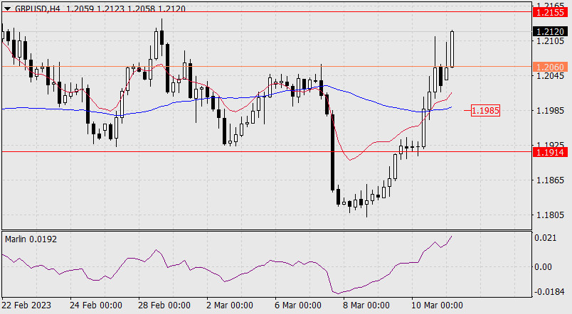 Прогноз по GBP/USD на 13 марта 2023 годаИнстаФорекс - Instaforex, 2 года назад На фоне пятничного ослабления доллара британский фунт подрос на 108 пунктов и сегодня утром открыл день с повышающимся разрывом. Данное обстоятельство затрудняет рост котировки до открытого целевого уровня 1.2155. Сигнальная линия осциллятора Марлин переместилась в положительную область и, напротив, помогает цене подрасти ещё. Сопротивление выступает индикаторная линия баланса.