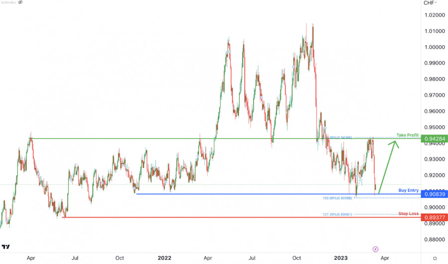 USD/CHF, D1: ожидается бычий отскок. Прогноз на 14 марта 2023ИнстаФорекс - Instaforex, 2 года назад В настоящее время пара USD/CHF тестирует основной уровень поддержки 0.9083, соответствующий уровню свинг-лоу. Отскок отсюда может привести к росту котировок до основного сопротивления на уровне 0.9428. Стоп-лосс ордер может быть размещен на отметке 0.8937, которая является уровнем свинг-лоу, выступающим в качестве поддержки, и уровнем расширения Фибоначчи 127%. Материал предоставлен компанией InstaForex - www.instaforex.com |