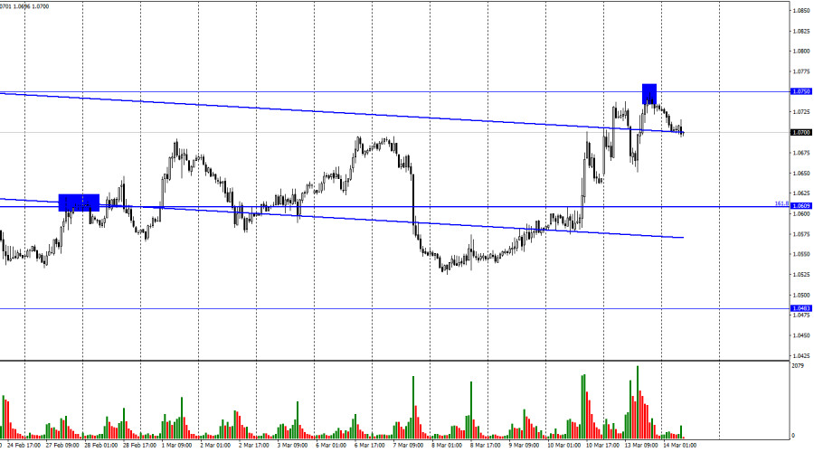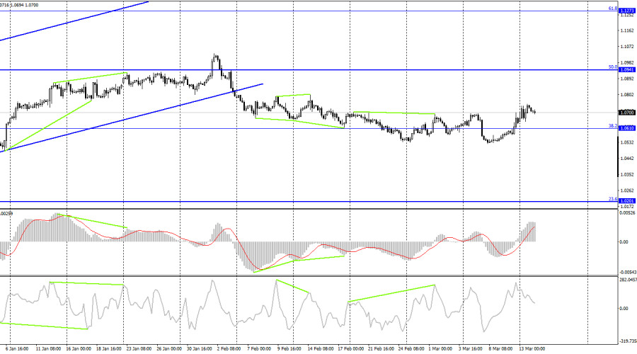 EUR/USD. 14 марта. Рынок успокаивается после шоковой терапииИнстаФорекс - Instaforex, 2 года назад Добрый день, уважаемые трейдеры! Пара EUR/USD в понедельник продолжала процесс роста. Лишь уровень 1,0750 остановил рост европейской валюты. Отбой курса пары от этого уровня сработал в пользу американской валюты и начала падения в направлении уровня коррекции 161,8%, 1,0609. Закрепление котировок над 1,0750 повысит шансы на продолжение роста в направлении следующего коррекционного уровня 200,0%, 1,0861. Нисходящий трендовый коридор больше не удерживает пару внутри себя. Понедельник можно назвать одновременно скучным и нескучным днем. Информационный фон экономического характера отсутствовал, но трейдеры еще с ночи начали вести активную торговлю на фоне новостей субботы и воскресения. Напомню, что в США обанкротилось два довольно крупных банка, а ФРС и Конгрессу пришлось в экстренном порядке делать заявления, суть которых сводилась к тому, что ситуация контролируемая, а все вкладчики обанкротившихся банков получат свои депозиты назад. Таким образом, ситуация неприятная и непростая, но не критическая. Банковская система не должна пострадать сильно. Тем не менее трейдеры не могли обойти стороной эти новости, поэтому мы и увидели сильное падение американской валюты. Но я считаю, что этот фон уже отработан трейдерами, а дальше на первый план вновь выйдут новости экономического характера. Сегодня будет опубликован отчет по инфляции в США за февраль, который может вызвать и новое падение доллара, и его быстрое восстановление. Сказать, каким получится отчет сейчас, не представляется возможным, поэтому и прогноз на сегодняшний день дать крайне сложно – все будет зависеть именно от этого отчета. На мой взгляд слабое падение индекса потребительских цен может вернуть пару к уровню 1,0609 или даже ниже. Я не считаю, что рост евровалюты последних дней будет продолжен, но существенное падение инфляции может помочь трейдерам-быкам продолжать оказывать давление на доллар. На 4-часовом графике пара выполнила закрепление под восходящим трендовым коридором, что позволяет по-прежнему ожидать дальнейшее падение, так как пара покинула коридор, в котором находилась с октября. Настроение трейдеров характеризуется как «медвежье», что открывает отличные перспективы роста для американской валюты с целью 1,0201. Однако в последнее время мы наблюдаем чаще горизонтальное движение. Отчет Commitments of Traders (COT):