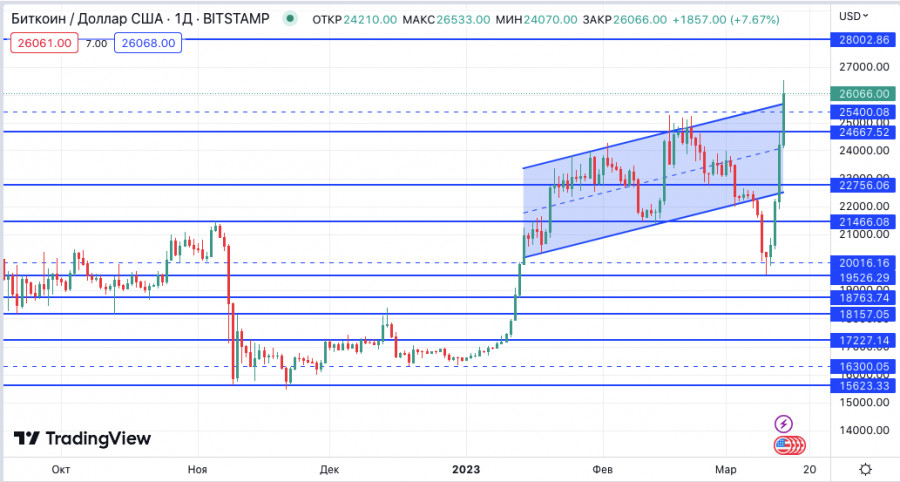 Bitcoin: инфляция сыграла на руку криптовалюте. Идем на $28 000?ИнстаФорекс - Instaforex, 2 года назад Bitcoin-ралли продолжается четвертую торговую сессию подряд. Сегодня, на момент написания обзора, главная криптовалюта выросла более чем на 7%, поднявшись, наконец, выше 25 000 долларов за монету - той самой границы, которую она не смогла преодолеть в феврале. Сегодня новым драйвером для роста стали данные по инфляции в США в результате чего главная криптовалюта поднялась выше 26 500 долларов. Данные Coinglass показывают, что этот шаг привел к ликвидации 120 миллионов долларов только за последний час, преобладающая часть которых пришлась на короткие позиции. Инфляция подстегнула надежды на замедление роста процентных ставокФевральская инфляция в США снизилась до 0,4% с 0,5% в январе в соответствии с оценками экономистов, сообщило во вторник Бюро трудовой статистики. В годовом исчислении инфляция замедлилась до 6,0% с 6,4% месяцем ранее, что также совпало с прогнозами. Базовый уровень инфляции, который исключает затраты на продукты питания и энергию, вырос более чем ожидалось - до 0,5% в феврале против 0,4% в январе и против прогнозов на 0,4%. Базовая инфляция в годовом исчислении составила 5,5%, как и ожидалось, по сравнению с 5,6% в январе. Цена BTCUSD выросла до девятимесячного максимума а несколько минут после отчета. Теперь не исключен откат к поддержке в области 25 000 долларов за монету. Хотя не исключен и безоткатный рост к цели в 28 000 долларов за монету. За последние несколько дней опасения по поводу инфляции отошли на второй план, поскольку инвесторам, правительству и Федеральной резервной системе пришлось иметь дело с возможными системными последствиями многочисленных банкротств банков. Менее недели назад трейдеры делали ставки на то, что ФРС повысит базовую ставку по федеральным фондам на 50 базисных пунктов на своем мартовском заседании. После краха Silicon Valley Bank в пятницу и закрытия Signature Bank на выходных трейдеры быстро изменились и теперь оценивают лишь минимальную вероятность любого повышения ставок в марте и снижения ставок к середине лета. Bitcoin-опционы торгуются в повышенном объемеОбъем торгов Bitcoin-опционами на бирже Deribit резко возрос после банкротства американских банков и вызванной этим волатильностью рынка. Опционы на Bitcoin на сумму 2,4 миллиарда долларов перешли к Deribit за последние 24 часа, что является самым высоким показателем за один день с 17 мая 2021 года, согласно данным, отслеживаемым Amberdata. Количество контрактов, проданных за последние 24 часа, достигло рекордного уровня в 99 195 BTC на момент публикации. Условный объем эфирных опционов за 24 часа на момент написания статьи составил 948 миллионов долларов, что является самым высоким показателем с ноября. На Deribit один опционный контракт представляет собой 1 BTC и 1 ETH. Биржа контролирует более 80% мирового рынка крипто-опционов. Опционы дают трейдерам право покупать или продавать базовый актив, в данном случае Bitcoin, по определенной цене, известной как страйк, к указанной дате. Опционы колл дают право на покупку, а опционы пут дают право на продажу. Почему растет спрос на опционыТри американских банка рухнули менее чем за неделю, что вызвало волатильность на финансовых рынках и вынудило трейдеров как криптовалютных, так и традиционных рынков применять стратегии хеджирования с помощью опционов. По данным Reuters, объем опци