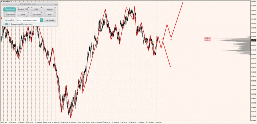 Область выгодных цен на покупку с точки зрения маржинального обеспечения располагается между зонами 1/4 и 1/2, построенными от максимума 13.03.2023.