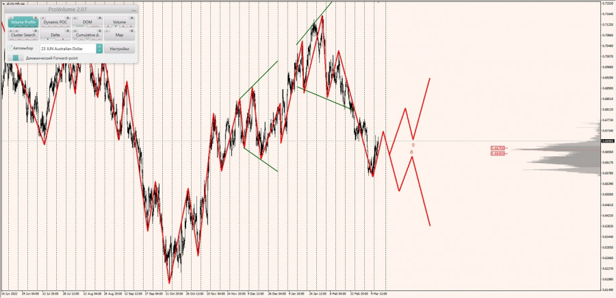 Долгосрочная тенденция: в шорт. Максимальное скопление объемов текущего контракта расположено в диапазоне по котировкам 0.66500-0.66700. В настоящий момент по паре совершаются инвестиционные операции выше, указывая на слабость продавцов.