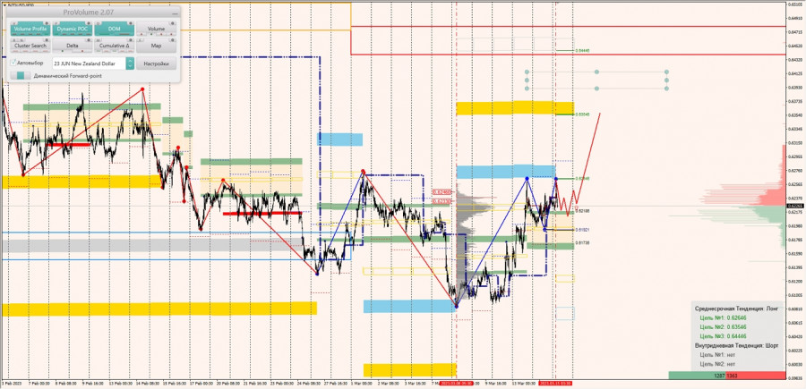 Среднесрочная тенденция: в лонг. Максимальное скопление объемов среднесрочной тенденции расположено в диапазоне по котировкам 0.62330-0.62460. В настоящий момент по паре совершаются инвестиционные операции ниже, указывая на слабость покупателей.