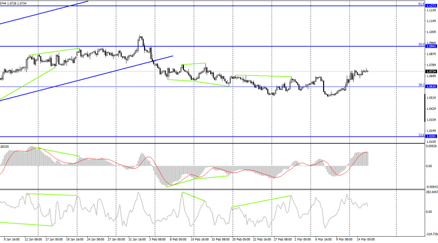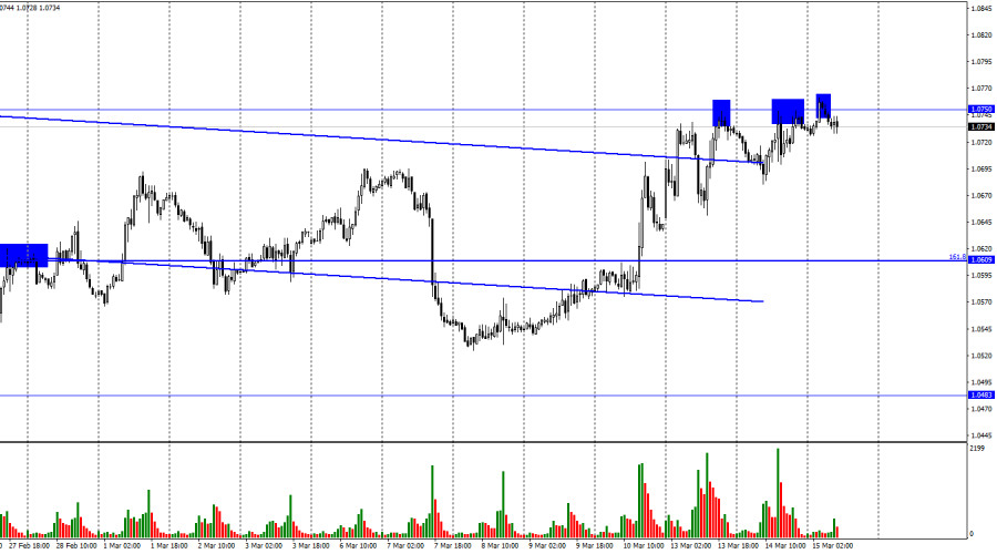 EUR/USD. 15 марта. Американская инфляция не впечатлила, на очереди – европейскаяИнстаФорекс - Instaforex, 2 года назад Добрый день, уважаемые трейдеры! Пара EUR/USD во вторник выполнила возврат к уровню 1,0750 и еще один или два отбоя от этого уровня. Однако разворота в пользу валюты США не произошло, как и падения котировок пары. Тем не менее до закрытия над уровнем 1,0750 падение может начаться в любой момент. Закрепление курса пары над 1,0750 позволит ожидать более сильный рост евровалюты в направлении уровня коррекции 200,0% - 1,0861. Вчерашний день был интересен для трейдеров только из-за отчета по американской инфляции. Мы уже давно привыкли к тому, что каждый отчет по инфляции вызывает сильную реакцию рынка, но вчерашний день стал исключением из правила. Индекс потребительских цен составил 6,0% в феврале, а базовая инфляция – снизилась до 5,5%. Из этих цифр можно сделать сразу несколько выводов. Основная инфляция замедлилась на 0,4%, что является очень неплохим темпом падения, который как бы говорит, что ФРС находится на правильном пути и более жесткого повышения процентной ставки не требуется. Однако базовая инфляция по-прежнему снижается очень медленно. Ее пиковое значение равняется 6,6%, в то время как обычная инфляция достигала 9,1%. Получается, что основная инфляция падает быстрее базовой, но именно базовая инфляция больше всего интересует ФРС, так как в ней не учитываются цены на энергоносители и продукты питания. Таким образом, если говорить о ставке в разрезе базовой инфляции, то вчера ФРС не получила сигнала о необходимости понизить ставку или остановить ее повышение. Мое мнение такое: FOMC будет и дальше продолжать ужесточение ДКП, невзирая на кризис в банковской системе. 22 марта ставка вырастет еще на 0,25%. Последствия банкротства банков в США будут нивелированы правительством и той же ФРС. А в мае можно ожидать повышения на 0,50%, если к тому времени инфляция вновь замедлится в своем падении. На 4-часовом графике пара выполнила закрепление под восходящим трендовым коридором, что позволяет по-прежнему ожидать дальнейшее падение, так как пара покинула коридор, в котором находилась с октября. Настроение трейдеров характеризуется как «медвежье», что открывает отличные перспективы роста для американской валюты с целью 1,0201. Однако в последнее время мы наблюдаем чаще горизонтальное движение. Отчет Commitments of Traders (COT):