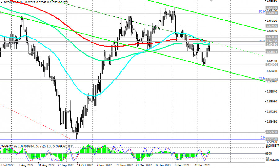 NZD/USD: сценарии динамики на 15.03.2023ИнстаФорекс - Instaforex, 2 года назад Как мы отметили мы в нашем сегодняшнем Фундаментальном анализе, сегодня американские и мировые фондовые индексы вновь снижаются, а американский доллар, напротив, укрепляется, в том числе на фоне сохраняющегося спроса на защитные активы после банковского кризиса в США. На момент публикации данной статьи пара NZD/USD торговалась вблизи отметки 0.6200, ниже ключевых среднесрочных уровней сопротивления 0.6305 (ЕМА50 на недельном графике), 0.6270 (ЕМА200 на дневном графике), оставаясь при этом в зоне глобального нисходящего тренда, ниже ключевых долгосрочных уровней сопротивления 0.6720 (ЕМА200 на месячном графике), 0.6600 (ЕМА200 на недельном графике), 0.6530 (ЕМА144 на недельном графике). При этом цена приближается к важному краткосрочному уровню поддержки 0.6186 (ЕМА200 на 1-часовом графике), пробой которого станет дополнительным сигналом для наращивания коротких позиций. В альтернативном сценарии вблизи данного уровня поддержки произойдет отбой, и NZD/USD вновь устремится вверх, в сторону уровней сопротивления 0.6305, 0.6270. В свою очередь, их пробой выведет NZD/USD в зону среднесрочного бычьего рынка с возможностью дальнейшего роста в сторону уровней сопротивления 0.6530, 0.6600. Здесь сигналом также может стать пробой локального и краткосрочного уровня сопротивления 0.6225. А пока же, и сегодня, предпочтительными остаются короткие позиции. *) об особенностях торговли NZD см. в статьях