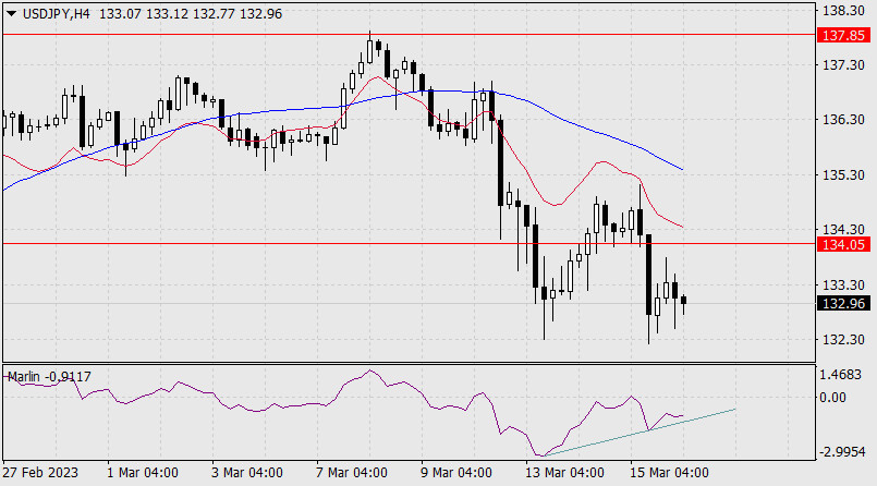 Прогноз по USD/JPY на 16 марта 2023 годаИнстаФорекс - Instaforex, 2 года назад Не фоне вчерашнего беспокойства как на Форекс, так и на других финансовых рынках, пара USD/JPY при торговом диапазоне 292 пункта закрыла день снижением на 95 пунктов. Цена во второй раз не смогла закрепиться под индикаторной линией баланса дневного масштаба (красные стрелки). Сегодня утром цена также безуспешно борется с данной поддержкой. Сигнальная линия осциллятора Марлин снижается на отрицательной территории, что немного повышает шансы на преодоление трудной поддержки. Если будут преодолены минимумы 13 и 15 марта 132.30 и 132.23, то цена сможет отработать линию Крузенштерна в районе отметки 130.95. Далее снижение может углубиться до линейной поддержки 130.35.
