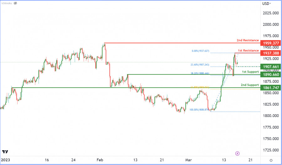 XAU/USD: ожидается формирование бычьего импульса. Прогноз на 16 марта 2023ИнстаФорекс - Instaforex, 2 года назад На 4-часовом графике пара XAU/USD развернулась от промежуточной поддержки 1,907, которая соответствует уровню коррекции Фибоначчи 23.60%. При развороте цены от этого уровня вверх пара укрепится до 1-го уровня сопротивления 1,937 и 2-го уровня сопротивления 1,959. В качестве альтернативы цена может пробить 1-й уровень поддержки 1,890, соответствующий 38.2% уровню коррекции Фибоначчи, вниз. В этом случае ожидается падение пары до 2-го уровня поддержки 1,861, который соответствует 61.8% уровню коррекции Фибоначчи. Материал предоставлен компанией InstaForex - www.instaforex.com |