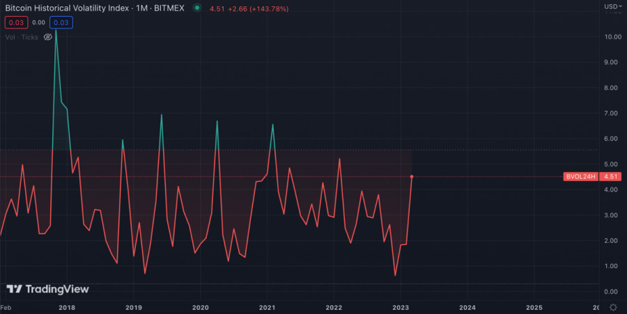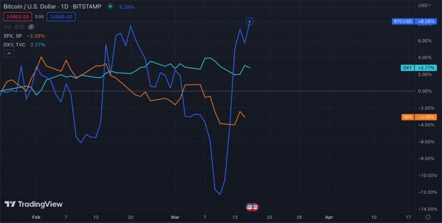 Рынок криптовалют преисполнился позитивом на фоне слухов о свертывании программы QT от ФРСИнстаФорекс - Instaforex, 2 года назад Биткоин и весь рынок криптовалют проводят текущую торговую неделю на бычьей ноте. Главной причиной для этого стал внезапно возникший кризис в банковской системе США. Инвесторы обратили внимание на децентрализованные активы, а потому по итогам текущей недели стоит ожидать позитивную динамику по притокам средств в крипто фонды. Биткоин стал основным бенефициаром паники инвесторов и получил прирост в 25%. По состоянию на 16 марта криптовалюта торгуется вблизи уровня $25k, и есть все основания полагать, что текущая макроэкономическая ситуация будет способствовать дальнейшему росту котировок актива. Планы ФРС и жестокая реальностьЕще две недели назад ситуация выглядела максимально пессимистичной. Инфляция снижалась медленно за счет чего ФРС прямо говорили о продлении ястребиной политики и более агрессивном повышении ставок. В это же время наблюдался пик изъятия ликвидности из американской экономики. Как результат инвесторы ринулись на казначейские облигации, что спровоцировало повышенное давление на BTC и SPX со стороны индекса доллара США. Ко всему прочему рынок труда оставался сильным, а число заявок по безработице не превышало 200 тысяч. Однако проблемы возникли там, где их мало ожидали – в банковском секторе, где возникли нереализованные убытки в размере $650 миллиардов. Ценные бумаги, купленные до агрессивного повышения ставки, в значительной мере утратили доходность. Эти факторы спровоцировали панику на финансовых рынках и перемещениякапитала. В это же время рынок труда дал первую трещину, и число заявок по безработице превысило 200 тысяч. Совокупность этих факторов поставила ФРС в ситуацию, когда текущая политика могла привести к массовым проблемам с ликвидностью в банковской системе, и как следствие существенным проблемам с безработицей и банкротствами. Однако падение инфляции до уровня 6% смягчило ситуацию, как для ФРС, так и для рынков, где начал преобладать позитив. Мы увидели рост драгметаллов и криптовалют, а также позитивные сигналы на рынке фьючерсов, где повышение ставки на 0,25% соперничает с завершением агрессивной политики. Анализ BTC/USDМощный рост Биткоина в очередной раз подтвердил зависимость криптовалюты от макро факторов и политики ФРС. Согласно аналитике BBG, рынки свопов начали закладывать смягчение монетарной политики в 2023 году на 1% от пиковых показателей. При этом ситуация с банковской системой США остается напряженной, и вполне вероятно, что ситуация с SVB повторится с другими компаниями. Учитывая это драгоценные металлы и Биткоин могут стать надежным сберегательным средством. Также это может означать, что в среднесрочной перспективе политика ФРС развернется на 180 градусов, что также позитивно скажется на котировках Биткоина. Первые сигналы к этому спровоцировали существенный всплеск "китовых" транзакций в диапазоне $25k-$26k, согласно данным Santiment. ИтогиУчитывая консолидацию BTC вблизи $25k, в ближайшее время можно ожидать повторное движение актива к этой отметке. На дневном графике уже формируется бычье пересечение на стохастике, а RSI постепенно возобновляет движение на север. Объемы торгов остаются на высоком уровне вблизи $45 миллиардов, что указывает на высокий интерес к BTC. Акти