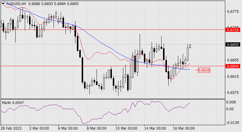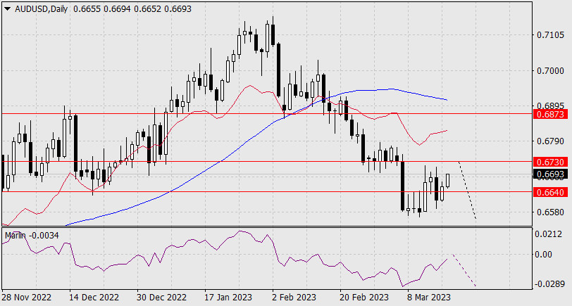 Прогноз по AUD/USD на 17 марта 2023 годаИнстаФорекс - Instaforex, 2 года назад Австралийский доллар вчера решил воспользоваться волной оптимизма на европейских рынках и подрос на 40 пунктов. Сегодня в азиатскую сессию он прибавляет ещё столько же. Возможно, целевой уровень 0.6730 будет достигнут, и к этому моменту сигнальная линия осциллятора Марлин дневного масштаба достигнет свою нулевую линию. После этого может последовать синхронный разворот цены и осциллятора от своих сопротивлений.