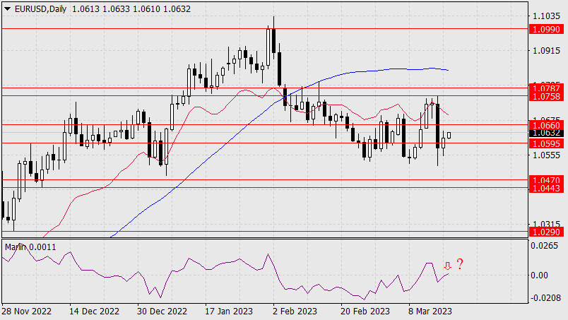 По итогу вчерашнего дня евро подрос на 36 пунктов. Такой рост нам говорит о том, что инвесторы, как и полгода, как и год назад, основное внимание уделяют политике ФРС. И вот что будет делать ФРС 22-го марта вызывает большой вопрос. Если ФРС повысит ставку на 0,50%, как ожидалось до банковского кризиса в США, то это также будет означать, что США игнорируют проблему и доллар направится в среднесрочное укрепление. Если ставка будет повышена лишь на 0,25%, то это будет означать признание проблемы, и тогда рост доллара уже под сомнением, не говоря уже об удержании ставки без изменения.