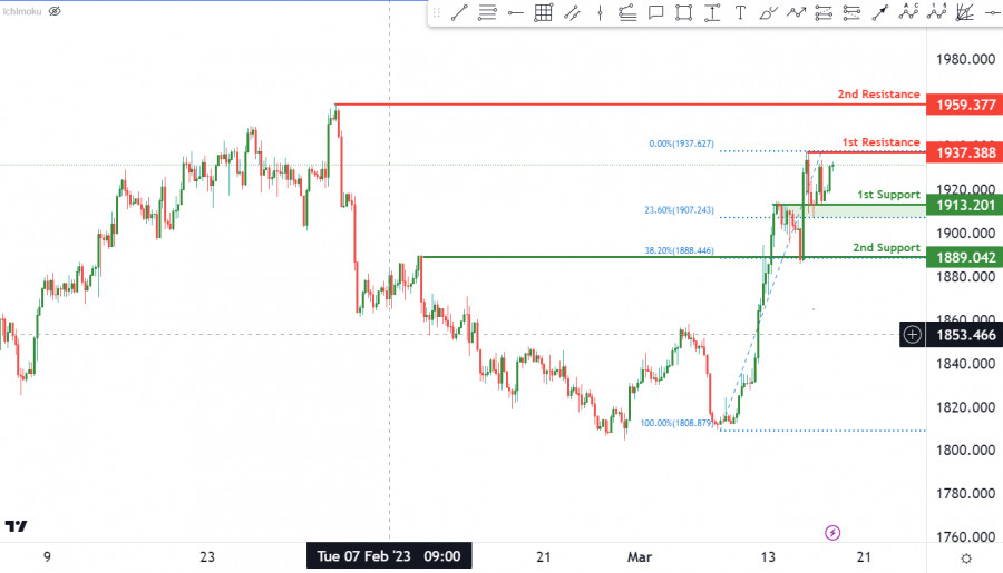 XAU/USD: ожидается дальнейшее развитие восходящей тендеции. Прогноз на 17 марта 2023ИнстаФорекс - Instaforex, 2 года назад Согласно 4-часовому графику, текущая тенденция пары XAU/USD является бычьей. Основываясь на анализе графика, есть вероятность продолжения восходящего движения к 1-му уровню сопротивления. Анализ также указывает на наличие двух сильных уровней поддержки. Первый уровень поддержки находится на отметке 1913 и соответствует уровню коррекции Фибоначчи 23.60%. Второй уровень поддержки расположен на уровне 1889, соответствующем уровню коррекции Фибоначчи 38.20%. Анализ также определяет два уровня сопротивления. Первый уровень сопротивления находится на отметке 1937 и является уровнем свинг-лоу, тогда как второй уровень сопротивления расположен на 1959 и соответствует уровню свинг-хай. Материал предоставлен компанией InstaForex - www.instaforex.com |