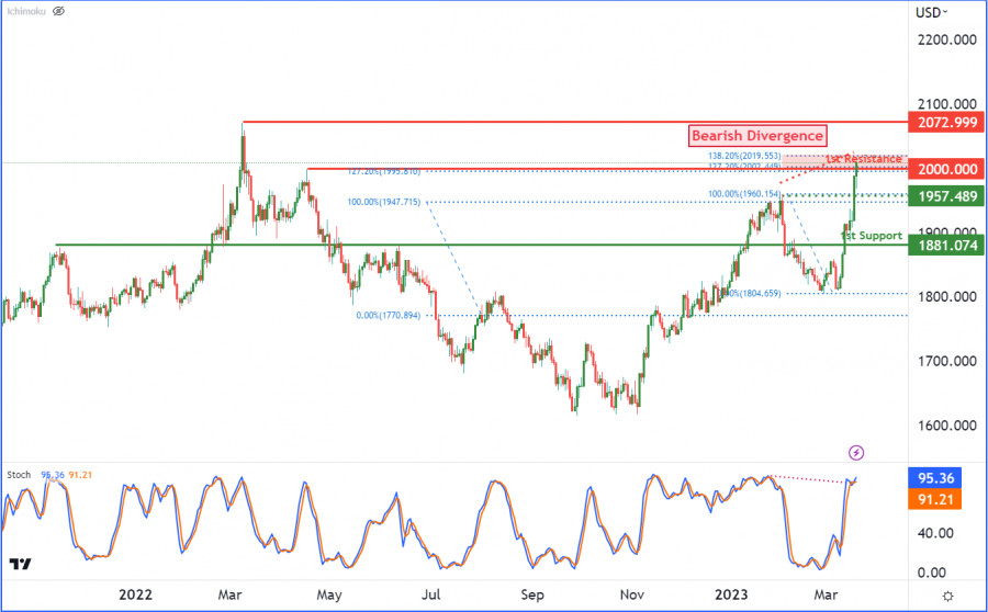 XAU/USD: возможен медвежий разворот. Прогноз на 20 марта 2023 г.ИнстаФорекс - Instaforex, 2 года назад Цены на золото уже некоторое время торгуются в медвежьем тренде, который поддерживается основной линией нисходящего тренда на графике XAU/USD. Ожидается, что цена будет двигаться между 1-ми уровнями поддержки и сопротивления. 1-й уровень поддержки расположен на отметке 1881 и соответствует уровню свинг-лоу, в то время как 1-й уровень сопротивления — это важный уровень свинг-хай на отметке 2000. Прорыв ниже уровня поддержки может привести к усилению медвежьего импульса и падению цены к промежуточному уровню поддержки на отметке 1957. И наоборот, прорыв выше уровня сопротивления может подтолкнуть цену ко 2-му уровню сопротивления 2072. Кроме того, медвежья дивергенция на индикаторе Стохастик указывает на возможный разворот в ближайшее время, что несколько усиливает медвежьи настроения. Материал предоставлен компанией InstaForex - www.instaforex.com |