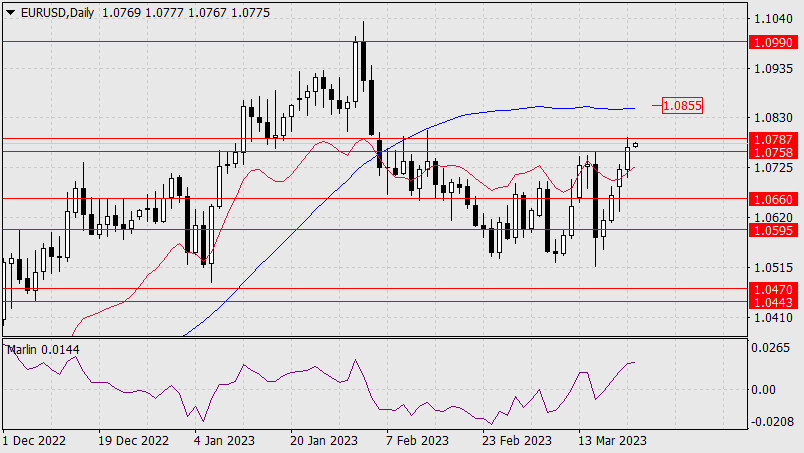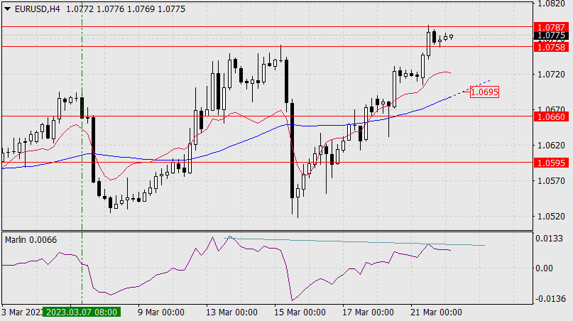 Прогноз по EUR/USD на 22 марта 2023 годаИнстаФорекс - Instaforex, 2 года назад Визит китайского государственного лидера Си Цзиньпиня в Москву, заверения министра финансов США Джанет Йеллен о готовности государства помогать средним и малым банкам, а также сохранение российского курса по сокращению добычи нефти на 500 млн б/д до конца июня (по заявлению Александра Новака), удержали интерес рыночных игроков к риску; S&P500 1,30%, нефть 4,02%, доходность по 5-летним американским гособлигациям возросла с 3,58% до 3,74%, золото подешевело на 1,92%, евро прибавил 47 пунктов (0,44%). Но на валютном рынке произошло расхождение – другие мировые валюты снизились: фунт -0,49%, «австралиец» -0,72%, йена -0,87%, «канадец» -0,32%. Думается, сегодняшнее повышение ставки ФРС вернёт евро в общевалютный понижающийся тренд.