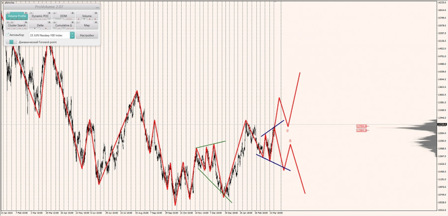 Среднесрочная тенденция: в лонг. Максимальное скопление объемов среднесрочной тенденции расположено в диапазоне по котировкам 12635.0-12675.0 и 12530.0-12565.0. В настоящий момент по Nasdaq совершаются инвестиционные операции внутри указанного диапазона, указывая на временную неопределенность.