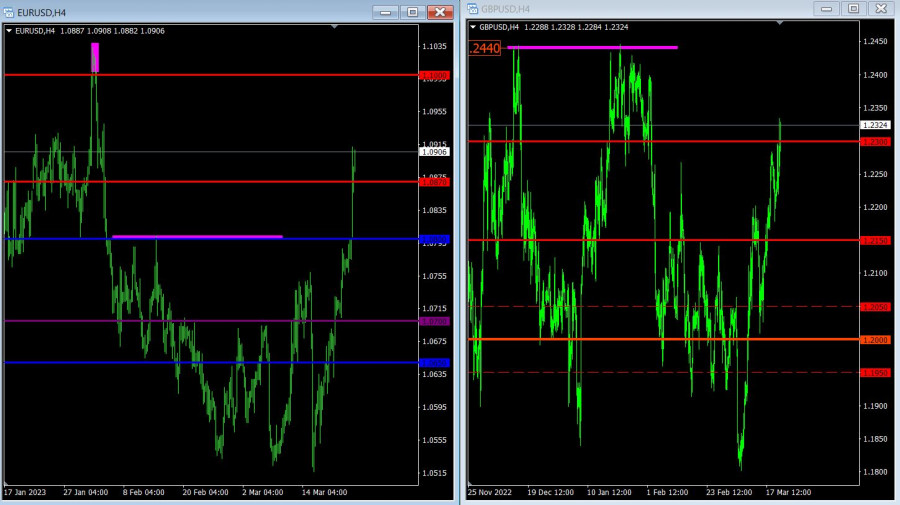 Торговый план по EUR/USD и GBP/USD на 23.03.2023ИнстаФорекс - Instaforex, 2 года назад Решение Федеральной Резервной Системы повысить ставку рефинансирования на двадцать пять базисных пунктов не стало чем-то неожиданным, так что никак не повлияло на рынки. В отличие от последующей пресс-конференции Джерома Пауэлла. Именно речь главы Федеральной Резервной Системы и дала старт падению американской валюты. Если вкратце, то создается впечатление, что американский регулятор в панике, и не понимает что делать. Именно такое впечатление возникает при прочтении стенограммы выступления Джерома Пауэлла. Смотрите сами, ранее Федеральная Резервная Система постоянно говорила о каких-то внешних факторах и всяких там злых умыслах со стороны России, а иногда и Китая. Теперь же, об этом ни слова. Только внезапно разразившийся банковский кризис. Джером Пауэлл конечно же попытался всех успокоить и преуменьшить данную ситуацию, но судя по котировкам, рынки ему не поверили. Даже несмотря на уже ритуальное повторение мантр о необходимости достижения цели по инфляции и сохранении высокой занятости, столь резкая смена риторики и расстановки акцентов явно дает понять, что американский регулятор, как минимум, пребывает в растерянности. Такое чувство, что положение дел в банковском секторе стало для регулятора полной неожиданностью. Сама подобная мысль конечно же пугает. И наверное нет никакого смысла отдельно разбирать причины возникающих ожиданий скорого снижения процентных ставок Федеральной Резервной Системы. Ставка рефинансирования (Соединенные Штаты): Но вчерашний день ограничивался не только заседанием Федерального комитета по операциям на открытом рынке. Неожиданный сюрприз преподнесла британская инфляция, которая вместо того чтобы замедлиться, вновь ускорилась. Что придает некоторую интригу сегодняшнему заседанию правления Банка Англии. Скорее всего ставка рефинансирования все же будет повышена на двадцать пять базисных пунктов. Однако, в последующих комментариях явно могут оказаться намеки на дальнейшее ужесточение монетарной политики. Из чего инвесторы сделают вывод, что к концу года, уровень процентных ставок в Великобритании все же будет выше, ежели в Соединенных Штатах. А это еще больше подстегнет рост фунта. А вместе с ним и единой европейской валюты. Ставка рефинансирования (Великобритания): Курс евро по отношению к доллару США в ходе сильного восходящего ралли достиг значения 1.0900. Этот шаг цены привел к пробою уровня 1.0800, что указало на восстановление цены относительно спада в период февраля. С учетом сильного изменения котировка за короткий промежуток времени возник сигнал о перекупленности евро, что допускает появление технического об откате. Однако, в случае если инерция сохранится на рынке котировка волне может дойти до локального максимума среднесрочного восходящего тренда. Валютная пара GBPUSD подскочила выше уровня 1.2300, что в очередной раз указало на стремление покупателей восстановить котировку относительно спада в период февраля. Стабильное удержание цены выше данного уровня допускает последующий рост до локального максимума среднесрочного тренда. В отличие от европейского коллеги сумела значительно укрепиться в стоимости. Это движение указывает на явный процесс восстановления цены относительно спада в период февр