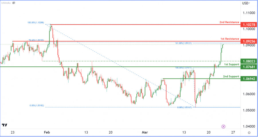 EUR/USD торгуется с понижением. Прогноз на 23 марта 2023 г.ИнстаФорекс - Instaforex, 2 года назад На 4-часовом графике пара EUR/USD торгуется с понижением, что указывает на потенциальное падение цены в долгосрочной перспективе. Однако в краткосрочной перспективе цена потенциально может подняться до 1-го уровня сопротивления 1.093, прежде чем развернуться и направиться к 1-му уровню поддержки 1.077. Затем цена, как ожидается, снизится ко 2-му сильному уровню поддержки 1.069. В случае падения, эти уровни могут привести к отскоку. С другой стороны, 1-й уровень сопротивления 1.093 соответствует уровню коррекции Фибоначчи 161.80%, что делает его значительным уровнем сопротивления. Второй уровень сопротивления 1.103 представляет собой уровень свинг-хай, который может оказать дополнительное сопротивление, если пара преодолеют 1-й уровень сопротивления. Также стоит обратить внимание на промежуточный уровень поддержки 1.080, расположенный между текущим уровнем и 1-м уровнем поддержки. Если цена преодолеет этот промежуточный уровень поддержки, ожидается усиление медвежьего импульса и снижение по направлению к 1-му уровню поддержки. Материал предоставлен компанией InstaForex - www.instaforex.com |