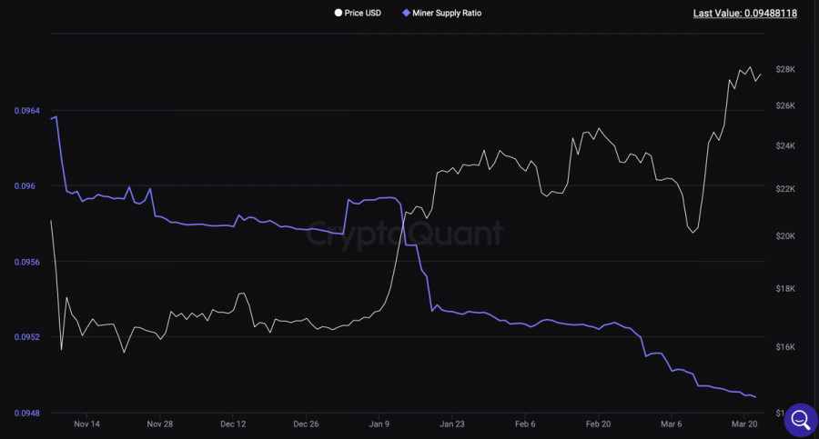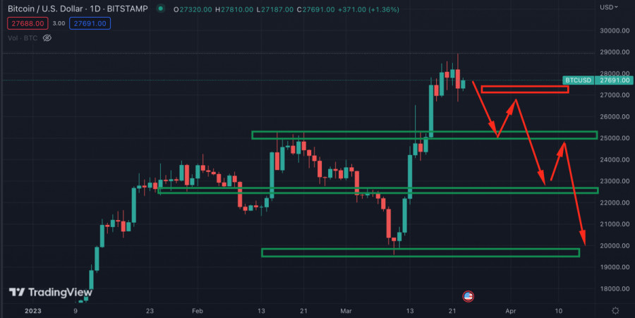 Биткоин сохранил устойчивость после заседания ФРС: что указывает на вероятность коррекции?ИнстаФорекс - Instaforex, 2 года назад Заседание ФРС от 22 марта называли ключевым событием, которое покажет как будет меняться ситуация в мировой экономике в ближайшие месяцы. Аналитики также называли вчерашнее заседание регулятора самым непредсказуемым с 2003 года. В преддверии встречи чиновников и решении вопроса о повышении ключевой ставки значительно возросла волатильность крипто рынка. Мы увидели резкие ценовые движения цены в обоих направлениях, а также позитивную риторику Пауэлла по итогам заседания. Итоги заседания ФРСФинансовые рынки готовились к тому, что несмотря на всю турбулентность банковской системы, ставка будет поднята на 25 базисных пунктов. Ровно так и произошло по итогам вчерашнего заседания, и уровень ключевой ставки достиг отметки 5%. По итогам заседания глава регулятора Пауэлл отметил, что ФРС рассматривала повышение пика ставки до ситуации в банковской системе. Чиновники рассматривали возможность сделать паузу в повышении ставки, но было принято решение поднять показатель на 25 б.п. Также Пауэлл отметил, что несмотря на турбулентность банковского сектора, ФРС продолжит сокращать баланс. ЦБ США продолжает свой курс на годовую инфляцию в 2% и будет принимать дальнейшие решения о повышении ставки по итогам рыночной ситуации. В целом ФРС осуществил те шаги, которых от нее ждали финансовые рынки, и потому мы увидели повышенную волатильность и резкое ценовое движение в обоих направлениях. Подводя итоги, нужно сказать, что фундаментального эффекта заседание ФРС не произвело, а импульсные движения цены – обычное дело при всплеске волатильности. Макроэкономические настроенияСитуация в банковской системе США кардинально изменила риторику ведущих финансовых институций, а также значительно увеличила спрос на криптовалюты. Согласно опросу BofA среди управляющих инвестиционными институциями резко выросла ожидания по снижению ставок в 2023 году. При этом большинство опрошенных уверены, что пик ставки сохранится на уровне 5%-5,25%. Как результат все больше управляющих ожидают увидеть рецессию экономики США во второй половине 2023. Аналитики того же BofA ожидают более сильного падения рынка акций после завершения цикла повышения ставки ФРС. Также в Goldman Sachs прогнозируют более осторожную политику региональных банков США в кредитовании, что способно еще больше усугубить ситуацию с ликвидностью. Учитывая ежемесячное изъятие $95 миллиардов из экономики США, совокупность этих факторов может сильно ударить по инвестиционной способности в Америке. Биткоин ожидает коррекционное движение?Заседание ФРС спровоцировало новые изменения в инвестиционной стратегии и в очередной раз подтвердило важность сохранения капитала, а не приумножения. Учитывая рост BTC в последние недели, стоит ожидать начало массовой фиксации прибыли. Аналитики Glassnode уже отмечали, что на рынке наблюдаются тенденции к распродаже актива для фиксации небольшой прибыли. Схожая ситуация наблюдается среди майнинг-игроков. За последние 2 дня запасы майнеров сократились на 668 BTC, что эквивалентно $18,3 миллионам. В это же время Биткоин вплотную приблизился к мощной зоне сопротивления $29k-$31,5k, где сосредоточены большие объемы ликвидности. По итогам вчерашнего дня BTC совершил 