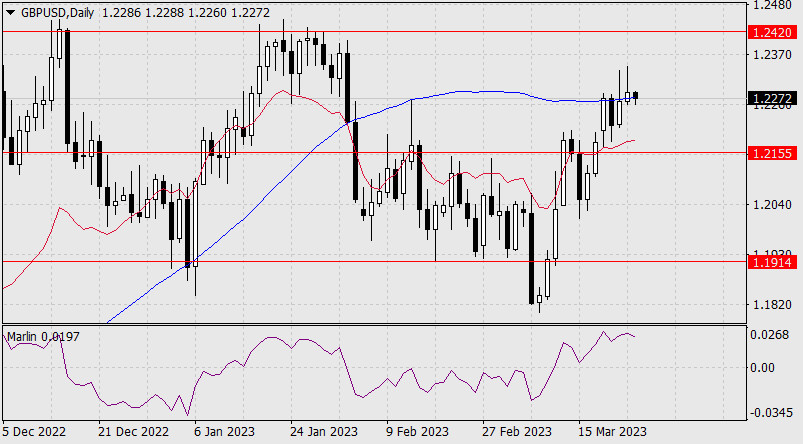 Прогноз по GBP/USD на 24 марта 2023 годаИнстаФорекс - Instaforex, 2 года назад Фунт стерлингов с большим усилием смог преодолеть сопротивление индикаторной линии Крузенштерна дневного масштаба, но закрепиться над ней не смог. Сегодня же в азиатскую сессию, при развороте осциллятора Марлин, фунт возвращается под индикаторную линию, и в случае закрепления под ней пойдёт в атаку на 1.2155 (минимум мая 2022 года). Закрепление под уровнем откроет цель 1.1914. А сейчас, при помощи осциллятора Марлин, внедряющегося на отрицательную территорию, цена попытается преодолеть поддержки линии Крузенштерна (1.2188) и ценового уровня 1.2155. |