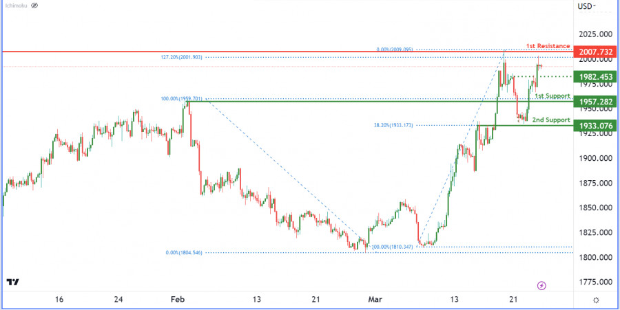 XAU/USD: ожидается снижение к уровню поддержки. Прогноз на 24 марта 2023ИнстаФорекс - Instaforex, 2 года назад На 4-часовом графике пара XAU/USD в настоящее время развивает медвежий импульс. Ожидается, что цена отскочит от 1-го уровня сопротивления 2007 и упадет до 1-го уровня поддержки 1957, а затем до 2-го уровня поддержки 1933. Первый уровень сопротивления расположен на отметке 2007 и соответствует уровню расширения Фибоначчи 127%. Промежуточный уровень поддержки 1982 может выступить в качестве поддержки отката, в случае падения цены. Материал предоставлен компанией InstaForex - www.instaforex.com |
