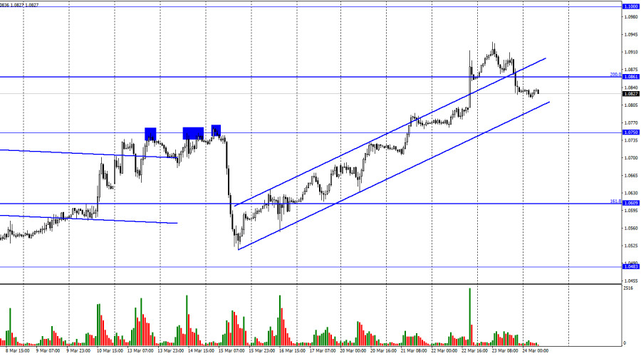 На последней отчетной неделе спекулянты закрыли 6886 контрактов Long и открыли 6865 контрактов Short. Настроение крупных трейдеров остается «бычьим» и продолжает в целом только усиливаться. Однако обращу внимание, что последний доступный отчет – от 7 марта. Отставание от реального времени составляет несколько недель. Общее количество контрактов Long, сосредоточенных на руках спекулянтов, теперь составляет 234 тысячи, а контрактов Short – 85 тысяч. Европейская валюта уже несколько недель падает, но при этом свежих данных COT в нашем распоряжении нет. В последние несколько месяцев шансы на рост евровалюты постоянно росли, как и сама евровалюта, но информационный фон не всегда поддерживал именно ее. Ситуация продолжает оставаться благоприятной для евро после длительного «черного периода», поэтому ее перспективы остаются неплохими. По крайней мере до тех пор, пока ЕЦБ повышает процентную ставку шагами по 0,50%. Календарь новостей для США и Евросоюза: Евросоюз – Индекс деловой активности в производственном секторе (PMI) (09-00 UTC). Евросоюз – Индекс деловой активности в секторе услуг (09-00 UTC). США – Базовые заказы на товары длительного пользования (12-30 UTC). США – Индекс деловой активности в производственном секторе (PMI) (13-45 UTC). США – Индекс деловой активности (PMI) в секторе услуг (13-45 UTC). 24 марта в Евросоюзе и США сегодня будет несколько интересных отчетов, но все они не обладают большим весом в глазах трейдеров. Влияние информационного фона на настроение трейдеров может быть слабым. Прогноз по EUR/USD и советы трейдерам: Продажи пары можно было открывать при закреплении под уровнем 1,0861 на часовом графике с целью 1,0750. Отбой от нижней линии коридора – закрываем позиции. Новые покупки возможны при отбое от нижней линии коридора на часовом графике с целями 1,0920–1,0941. Материал предоставлен компанией InstaForex - www.instaforex.com |