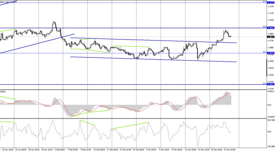 EUR/USD. 24 марта. Медведи не получили поддержки информационного фона на неделеИнстаФорекс - Instaforex, 2 года назад Добрый день, уважаемые трейдеры! Пара EUR/USD в четверг выполнила разворот в пользу американской валюты и падение практически к нижней линии восходящего трендового коридора, который продолжает характеризовать настроение трейдеров как «бычье». Закрепление курса пары под коридором повысит вероятность более сильного падения в направлении уровня 1,0750 и 1,0609. Вчерашний день был более важным для британца, чем для европейца. Заседание Банка Англии должно было ответить на вопрос, как будет дальше действовать регулятор, чтобы понизить инфляцию, которая вновь начала расти. Но об этом поговорим в соответствующей статье. Для евро-доллара вчера интересного не было практически ничего. На фоне повышения ставки ФРС на 0,25% доллар США упал еще ниже, хотя он рос до этого в течение всей недели, а повышение ставки является «ястребиным» решением, и должно было вызвать рост доллара. Тем не менее, трейдеры рассмотрели в речи Пауэлла «голубиные» намеки, а помимо этого, FOMC близится к тому моменту, когда ставка перестанет повышаться каждое заседание. Я думаю, что разница во взглядах ЕЦБ и ФРС на будущее и позволила европейской валюте порядочно вырасти на этой неделе. ЕЦБ повысил ставку на 0,50%, дав понять трейдерам, что будет еще несколько ужесточений. ФРС может завершить программу ужесточения уже на следующем заседании, до которого выйдет еще два отчета по инфляции. Если они покажут уверенные темпы снижения, тогда у ФРС уже не будет никаких причин повышать процентную ставку. На фоне этого европейская валюта может продолжать процесс роста в ближайшие два месяца, но хочу заметить, что ЕЦБ не обладает таким же потенциалом повышения ставки, как ФРС. Его ставка вряд ли вырастет до 5% или больше. Рост пары остается более вероятным, но я не исключаю, что падение тоже может быть. Графический анализ пока поддерживает рост евро. На 4-часовом графике пара выполнила вчера закрепление над нисходящим трендовым коридором, что позволяет рассчитывать на продолжение роста в направлении следующего коррекционного уровня 50,0%, 1,0941. Назревающих дивергенций сегодня не наблюдается ни у одного индикатора. Отбой котировок от уровня 1,0540 сработает в пользу начала падения в направлении уровня Фибо 38,2%, 1,0610, закрепление над ним повысит вероятность продолжения роста в направлении следующего уровня коррекции 61,8%, 1,1273. Отчет Commitments of Traders (COT):