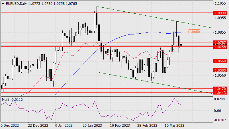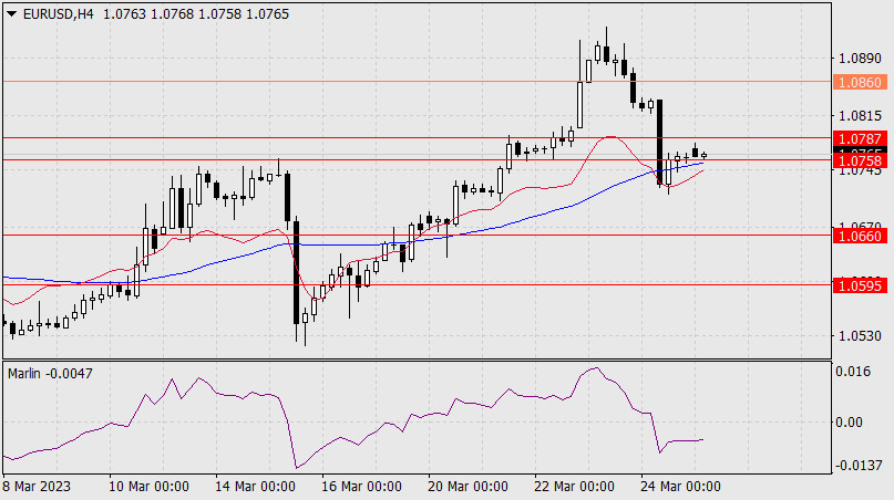 Прогноз по EUR/USD на 27 марта 2023 годаИнстаФорекс - Instaforex, 2 года назад Пятничный день евро закрыл снижением на 71 пункт. Была предпринята попытка цены выйти из целевого диапазона 1.0758/87, достаточно сильная, но закрытие дня произошло всё же внутри диапазона. Осциллятор Марлин дневного масштаба усилил снижение. Теперь, после закрепления цены под 1.0758, ждём цену у целевой поддержки 1.0660.