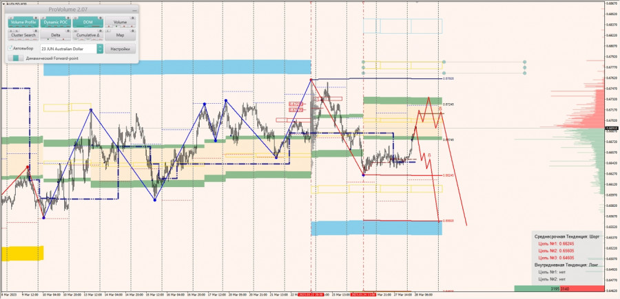 Среднесрочная тенденция: в шорт. Максимальное скопление объемов среднесрочной тенденции расположено в диапазоне по котировкам 0.67170-0.67250. В настоящий момент по паре совершаются инвестиционные операции ниже, указывая на силу продавцов.